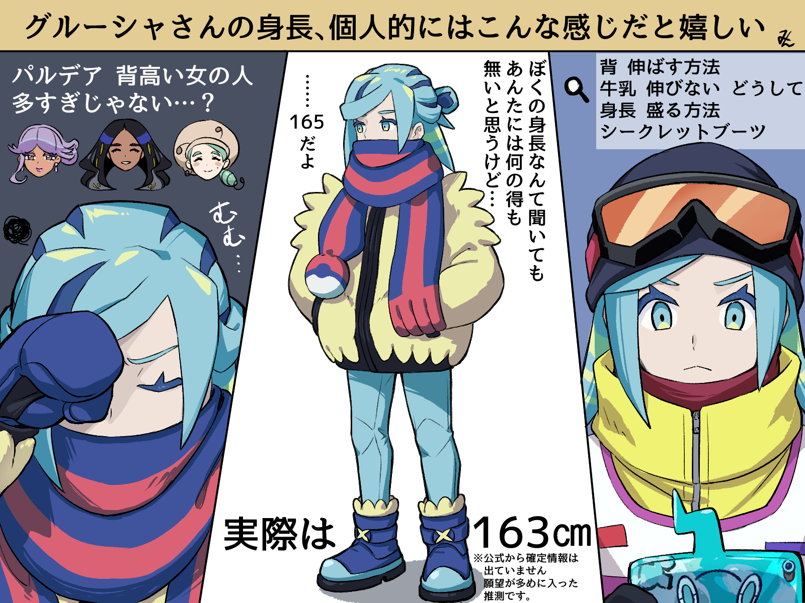 1boy 3girls aqua_eyes aqua_hair blue_boots blue_mittens blue_scarf boots closed_eyes closed_mouth commentary_request eyelashes geeta_(pokemon) gen_4_pokemon grusha_(pokemon) hair_bun hands_in_pockets height highres holding holding_phone jacket katy_(pokemon) medium_hair min_(myna8247) mittens multiple_girls nintendo pants phone poke_ball_print pokemon pokemon_(anime) pokemon_horizons pokemon_scarlet_and_violet rotom rotom_phone scarf squiggle standing striped_clothes striped_scarf translation_request tulip_(pokemon) yellow_jacket zipper_pull_tab