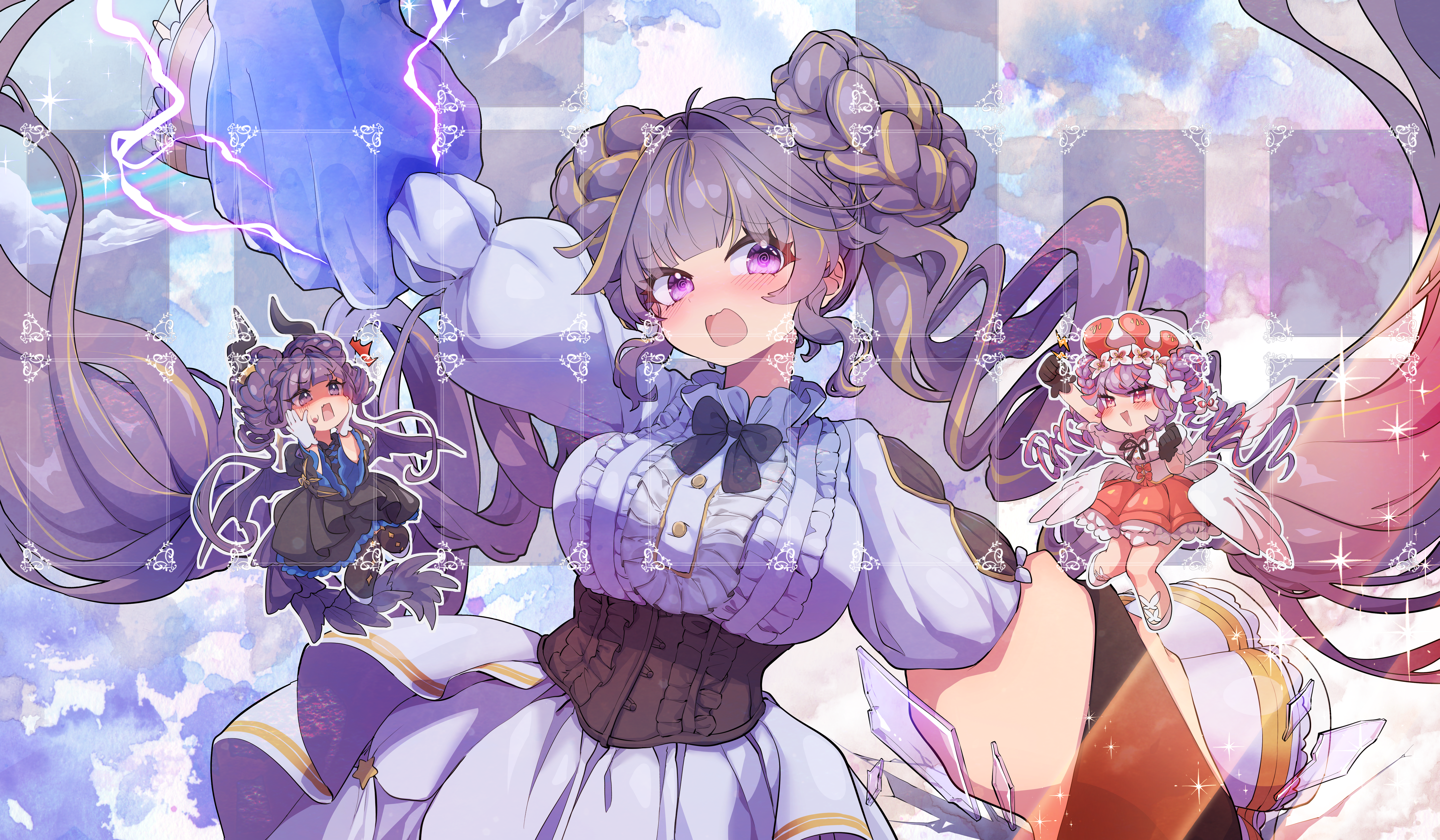 4girls @_@ absurdres angel angel_wings angello_vaalmonica black_wings blonde_hair blue_eyes breasts broken_glass c_civciv cowboy_shot demon_girl demon_wings dimonno_vaalmonica donut_hair_bun double_bun dress drill_hair duel_monster duralume_vaalmonican_heathen_hallow feathered_wings glass hair_bun highres large_breasts long_hair mini_person multicolored_hair multiple_girls purple_eyes purple_hair red_eyes red_hair selettrice_vaalmonica twin_drills two-tone_hair very_long_hair white_dress white_wings wings yu-gi-oh! zebufera_vaalmonican_hallow_heathen