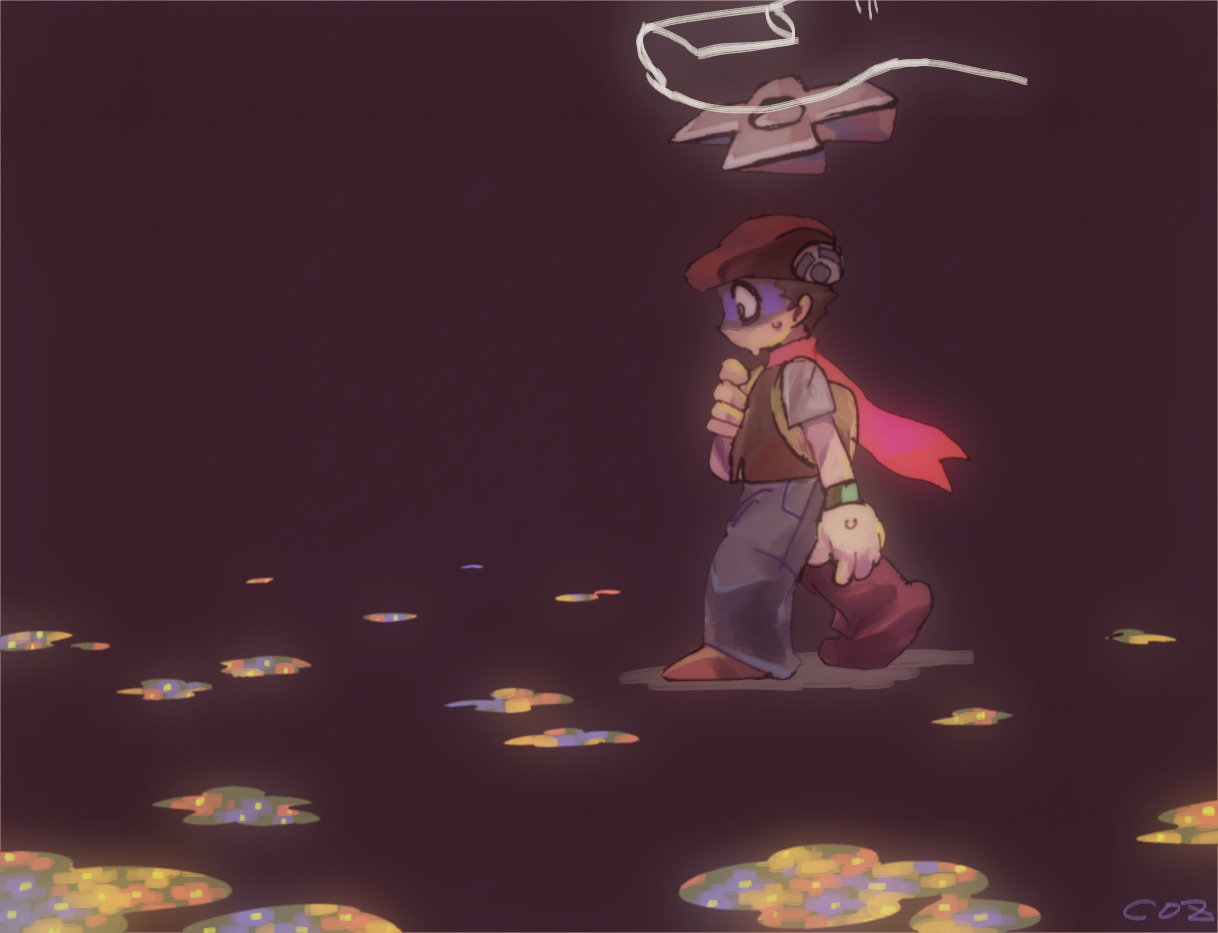 1boy black_vest blue_pants cozqqq d-pad dark_background from_side full_body gameplay_mechanics hat lucas_(pokemon) male_focus nintendo pants pokemon pokemon_diamond/pearl/platinum poketch red_hat red_scarf scared scarf shirt short_hair short_sleeves signature sweat vest watch white_shirt wide-eyed wristwatch yellow_bag