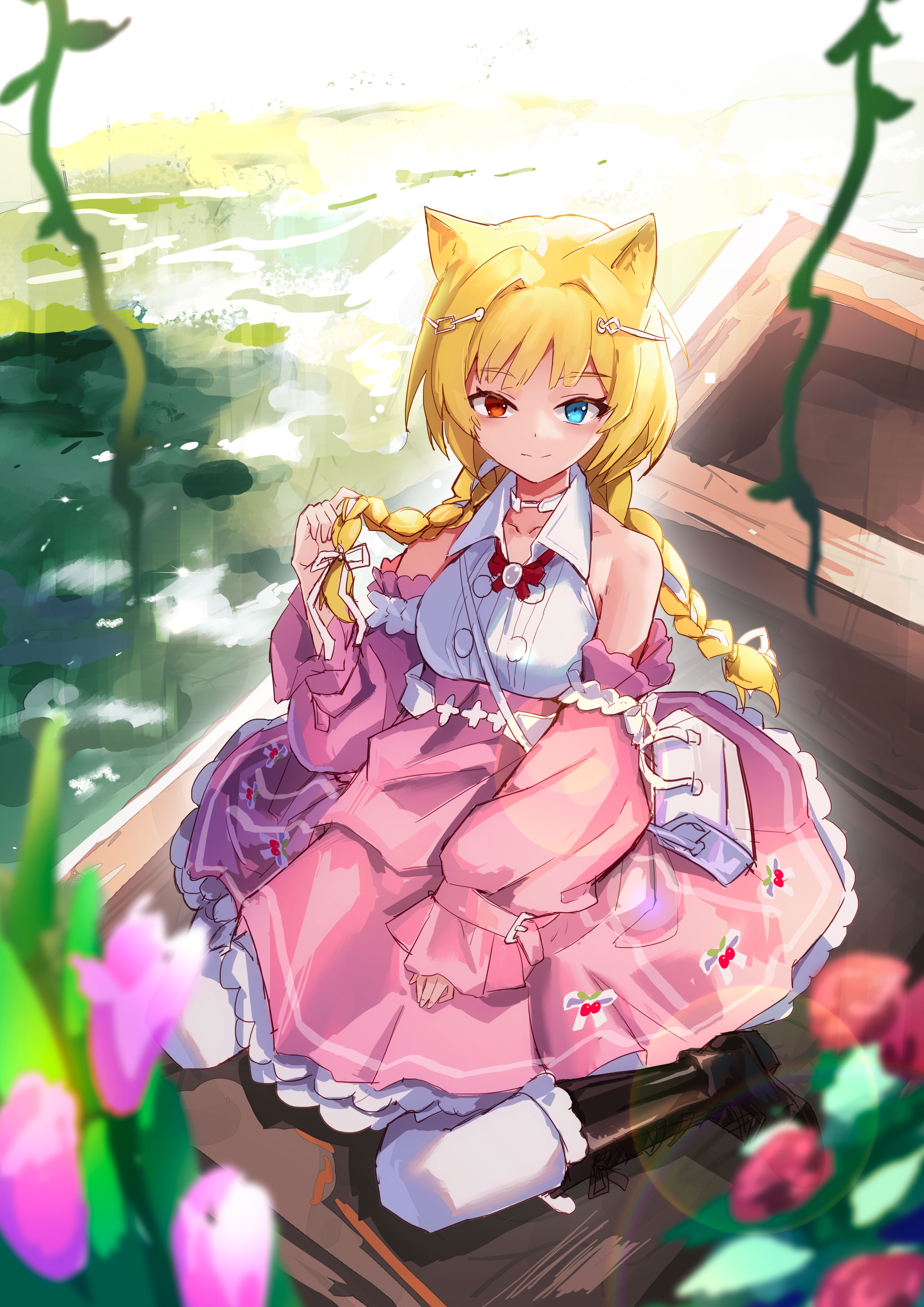 1girl absurdres animal_ears arknights bare_shoulders blonde_hair blue_eyes braid chinese_commentary closed_mouth collarbone collared_shirt commentary detached_sleeves fenglai_thewind full_body hair_intakes hair_lift hair_ornament hair_ribbon hairclip heterochromia high-waist_skirt highres lens_flare long_hair long_sleeves looking_at_viewer nightmare_(arknights) nightmare_(the_ferry_girl)_(arknights) official_alternate_costume orange_eyes pink_skirt pink_sleeves ribbon shirt sitting skirt sleeveless sleeveless_shirt smile solo split_mouth twin_braids white_ribbon white_shirt