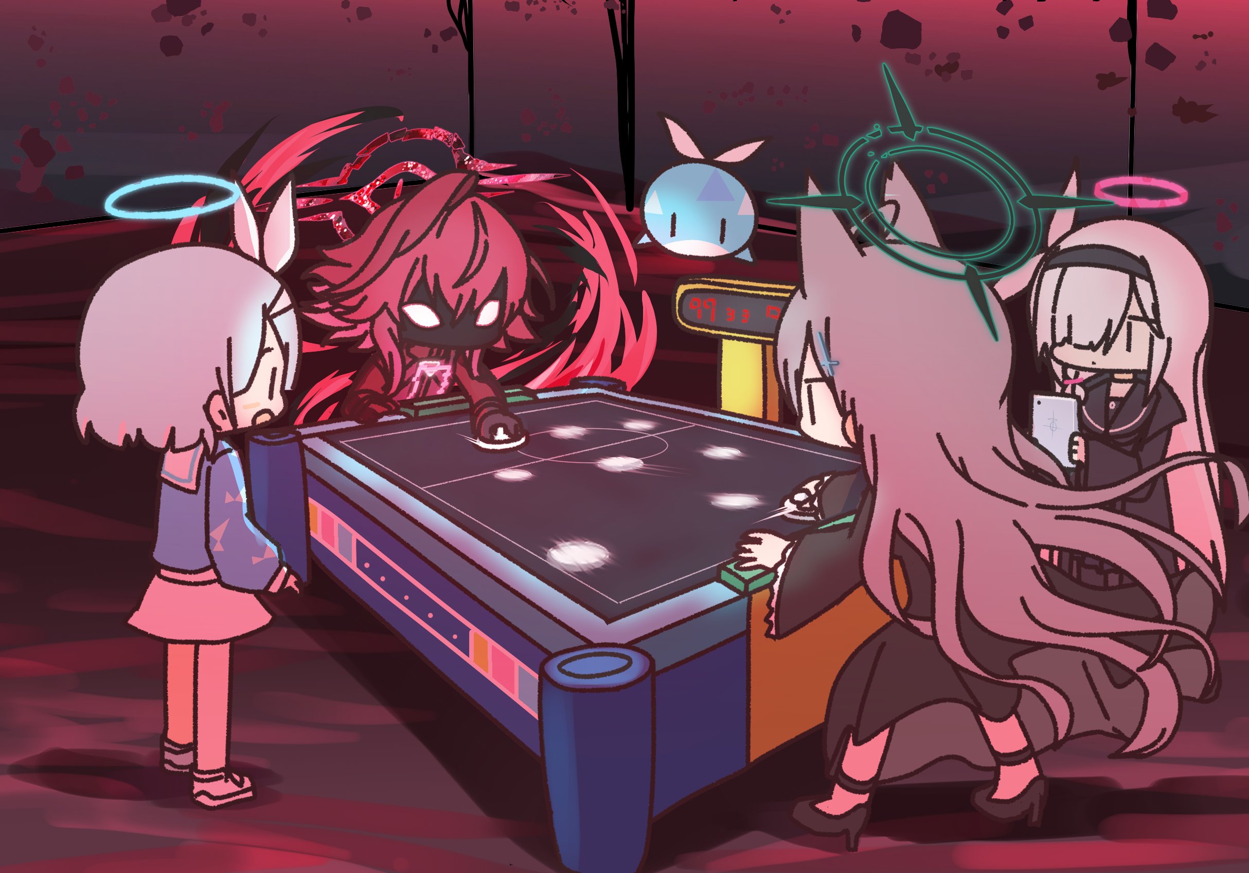 4girls air_hockey animal_ears arona_(blue_archive) blue_archive blue_halo chibi chibi_only dark_persona grey_hair halo highres holding holding_phone hoshino_(blue_archive) hoshino_terror_(blue_archive) multiple_girls mundane_made_awesome phone pink_halo plana_(blue_archive) playing_games red_hair red_halo shiroko_terror_(blue_archive) short_hair standing wide_shot wolf_ears yukko_(hcryh955) |_|