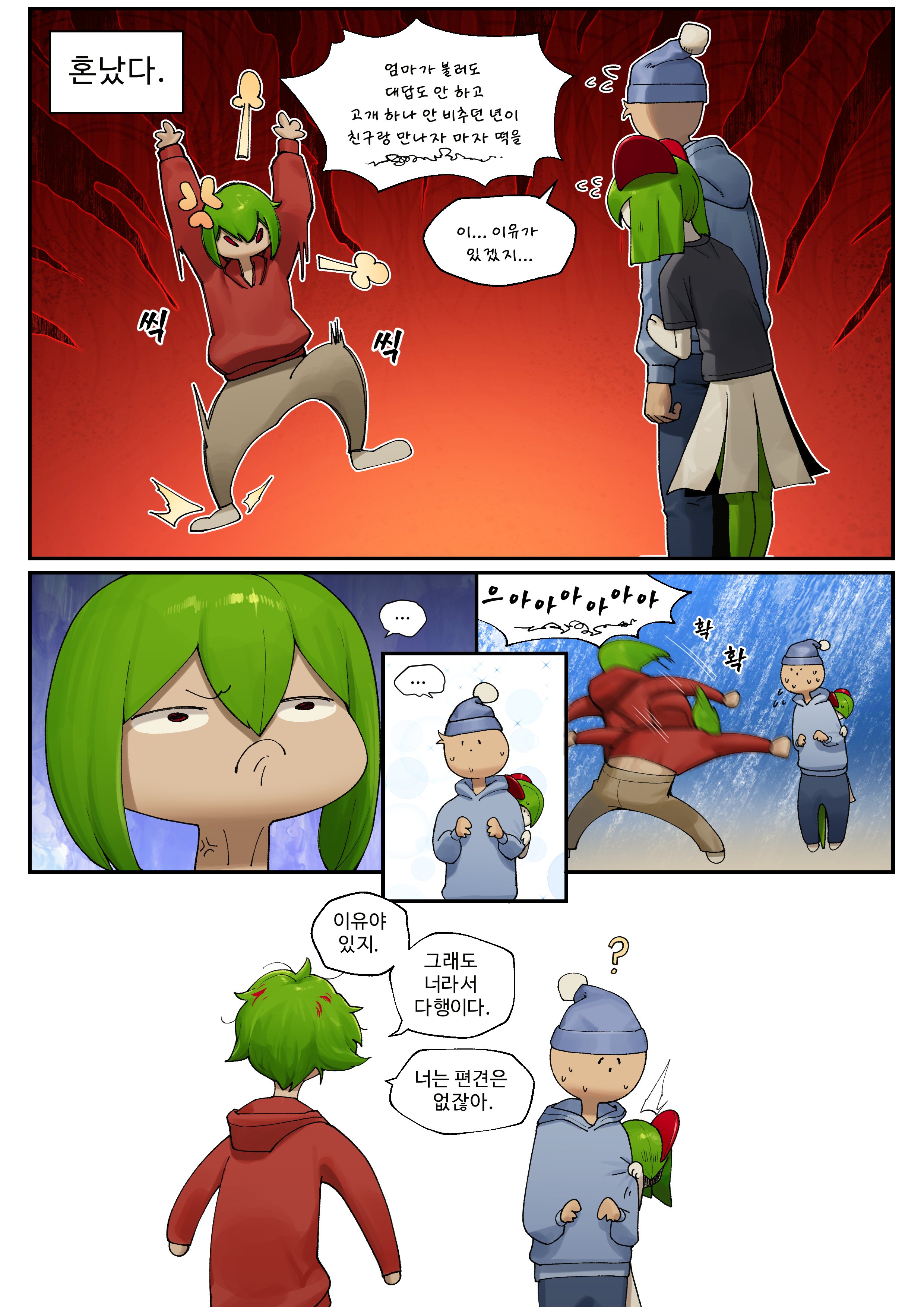... 1girl 2boys absurdres black_shirt blue_hat blue_hoodie clothed_pokemon colored_skin gen_3_pokemon green_hair green_skin gu_deulmok hat highres hood hoodie horns kirlia multicolored_skin multiple_boys nintendo pokemon pokemon_(creature) red_hoodie shirt sidelocks speech_bubble translation_request two-tone_skin white_skin
