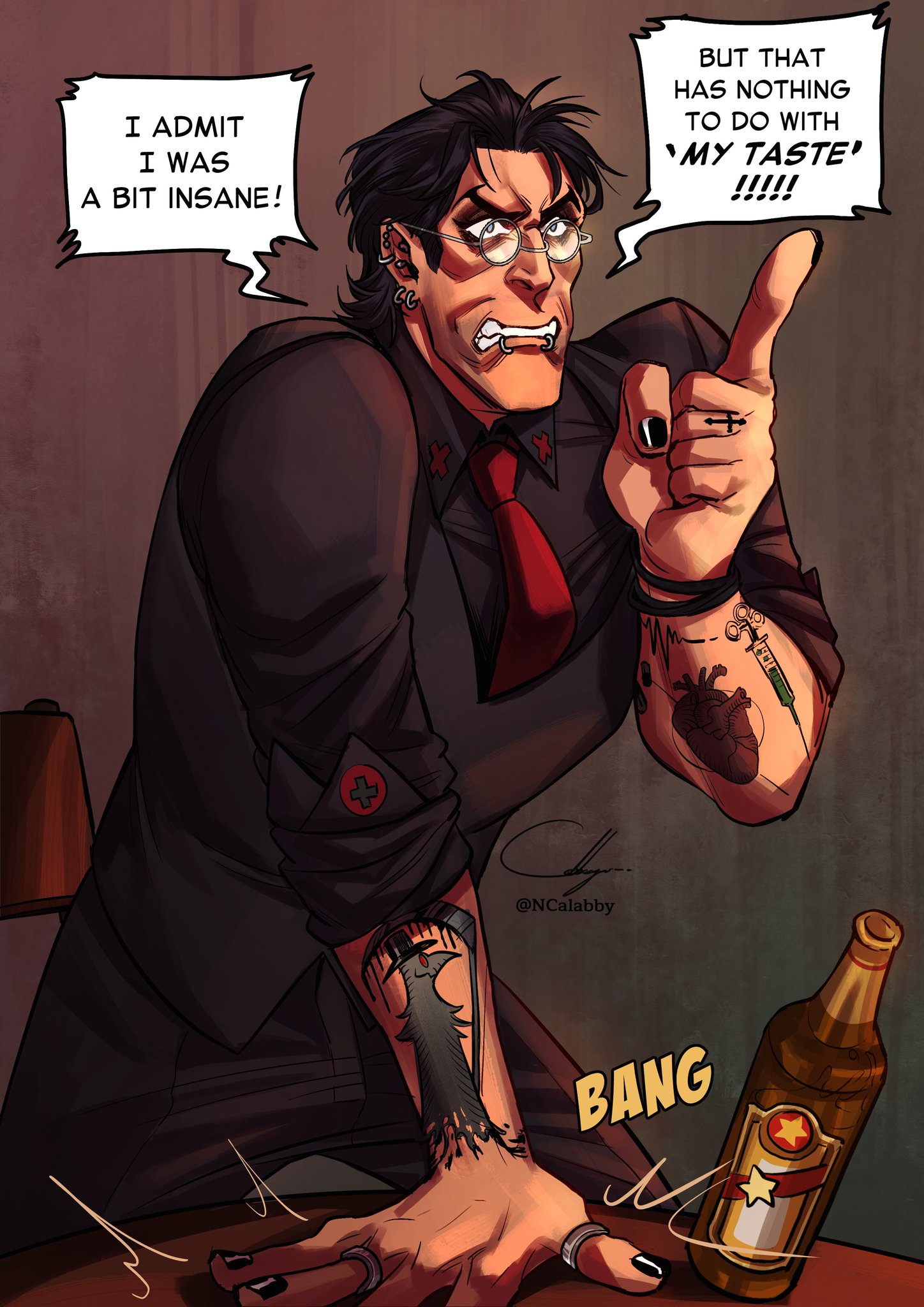 1boy alternate_costume angry arm_tattoo beer_bottle black_hair black_nail_polish black_nails black_pants black_shirt black_vest blue_eyes bottle cabbage_(ncalabby) chair clenched_teeth collared_shirt cross cross_print cross_tattoo ear_piercing earrings emo_fashion english_text face_piercing furrowed_brow glasses hand_on_table hand_rest hand_up heart heart_tattoo highres jewelry lip_piercing long_sleeves looking_afar male_focus mature_male medic_(tf2) messy_hair multiple_rings nail_polish necktie pants piercing plague_doctor plague_doctor_tattoo reaper reaper_tattoo red_necktie ring shirt short_hair signature simple_background sleeves_rolled_up speech_bubble syringe syringe_tattoo table tattoo team_fortress_2 teeth vest
