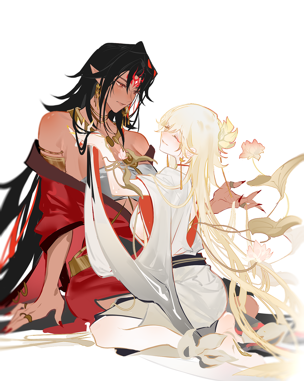 2girls asura_(onmyoji) bare_shoulders barefoot black_hair blonde_hair closed_eyes dark-skinned_female dark_skin earrings facial_mark flower forehead_mark genderswap genderswap_(mtf) highres jewelry long_hair looking_at_another lotus multicolored_hair multiple_girls onmyoji pointy_ears red_eyes red_nails simple_background sitting smile taishakuten_(onmyoji) very_long_hair white_background yinzinmiemie yuri