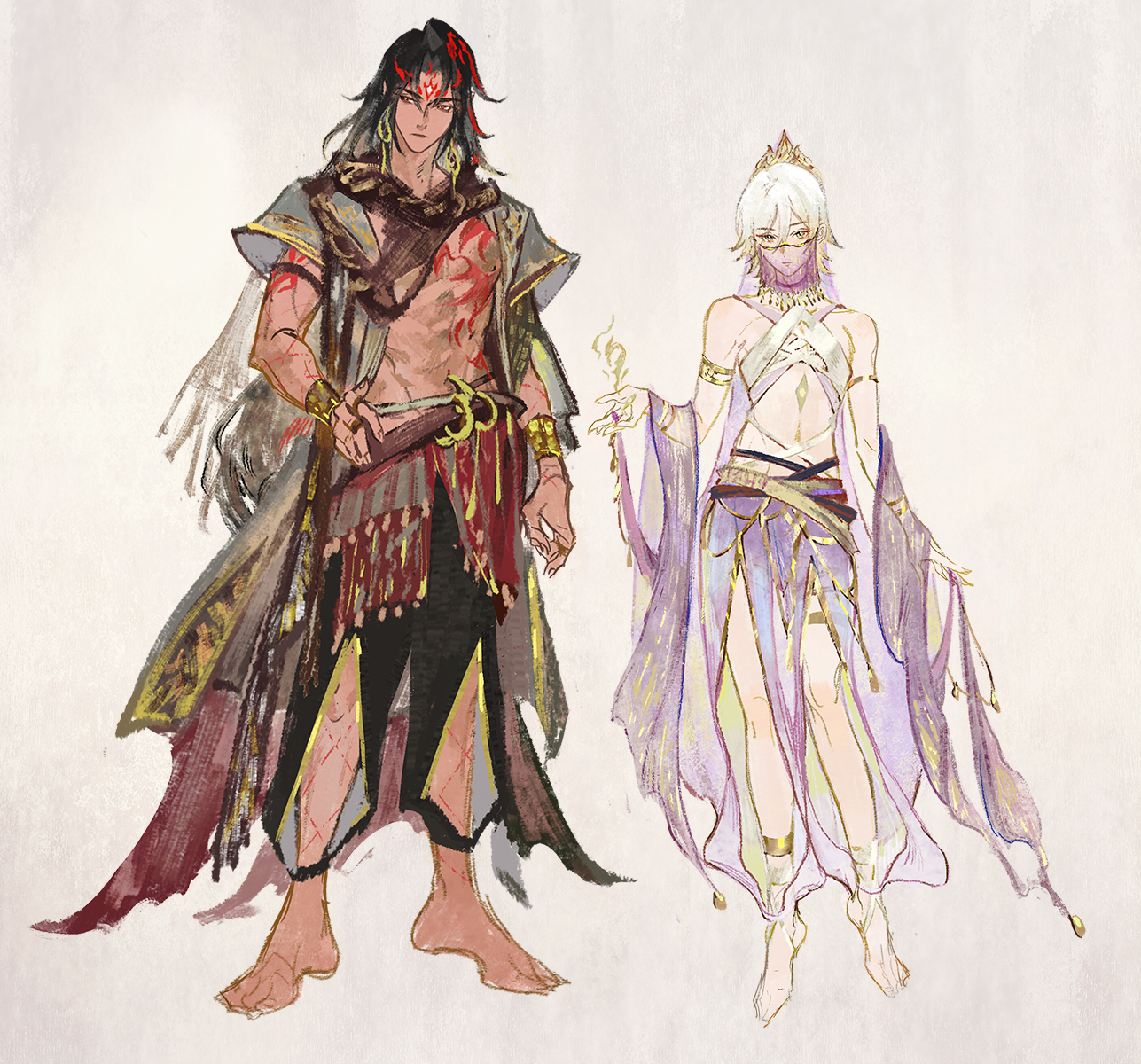 2boys anklet arabian_clothes armlet asura_(onmyoji) bare_shoulders barefoot black_hair bracelet closed_mouth dark-skinned_male dark_skin detached_sleeves earrings full_body hair_between_eyes highres holding jewelry long_hair looking_at_viewer male_focus midriff mouth_veil multicolored_hair multiple_boys navel onmyoji pants pectorals see-through_clothes short_hair simple_background standing taishakuten_(onmyoji) tattoo toned toned_male two-tone_hair veil white_hair wide_sleeves yellow_eyes yinzinmiemie
