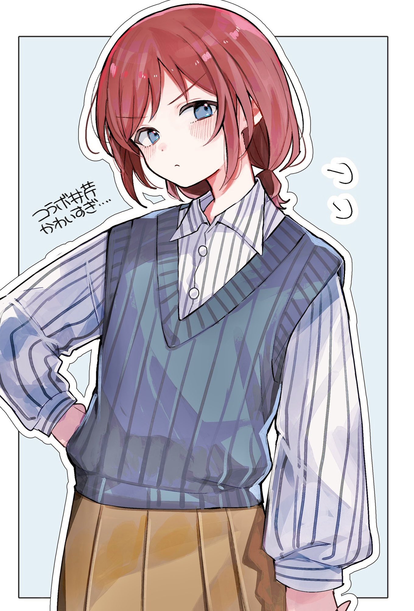 1girl blue_background blue_eyes blue_sweater_vest border brown_skirt closed_mouth collared_shirt commentary_request girls_band_cry highres iseri_nina long_sleeves looking_at_viewer low_twintails na_(niruo3) outline outside_border pleated_skirt red_hair shirt short_hair short_twintails simple_background skirt solo striped_clothes striped_shirt sweater_vest translation_request twintails white_border white_outline white_shirt