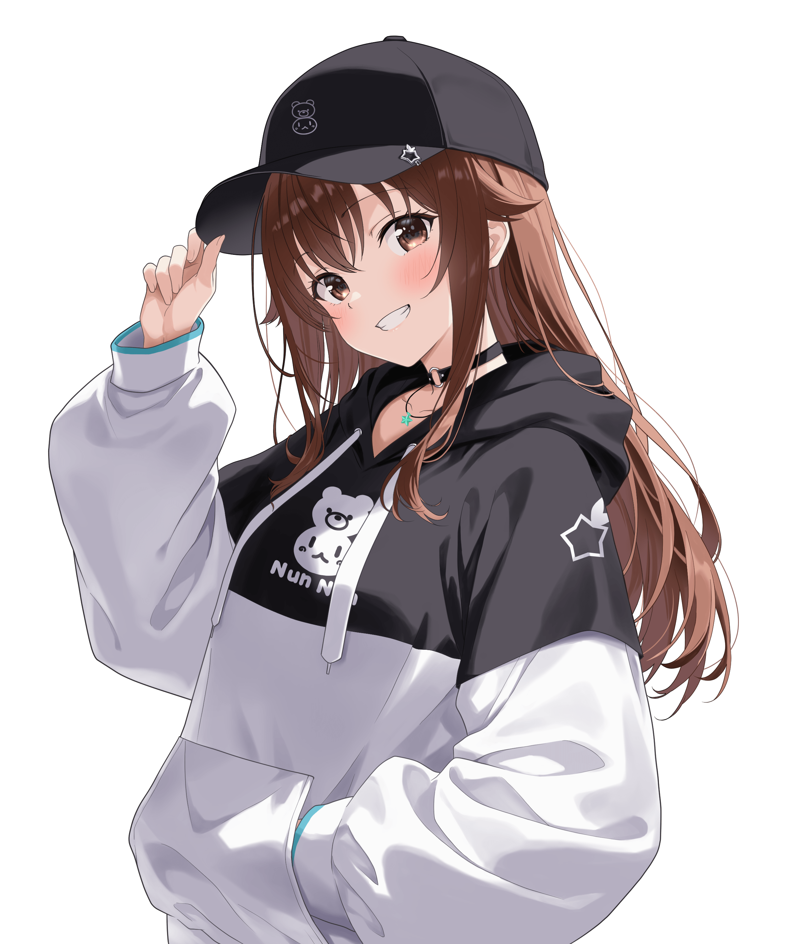 1girl absurdres aozora_no_oto baseball_cap black_choker black_hat black_hoodie breasts brown_eyes brown_hair choker hand_in_pocket hat highres hololive hood hoodie jewelry long_hair medium_breasts parted_lips pendant simple_background smile solo teeth tokino_sora tokino_sora_(dj_hoodie) transparent_background upper_body virtual_youtuber white_hood