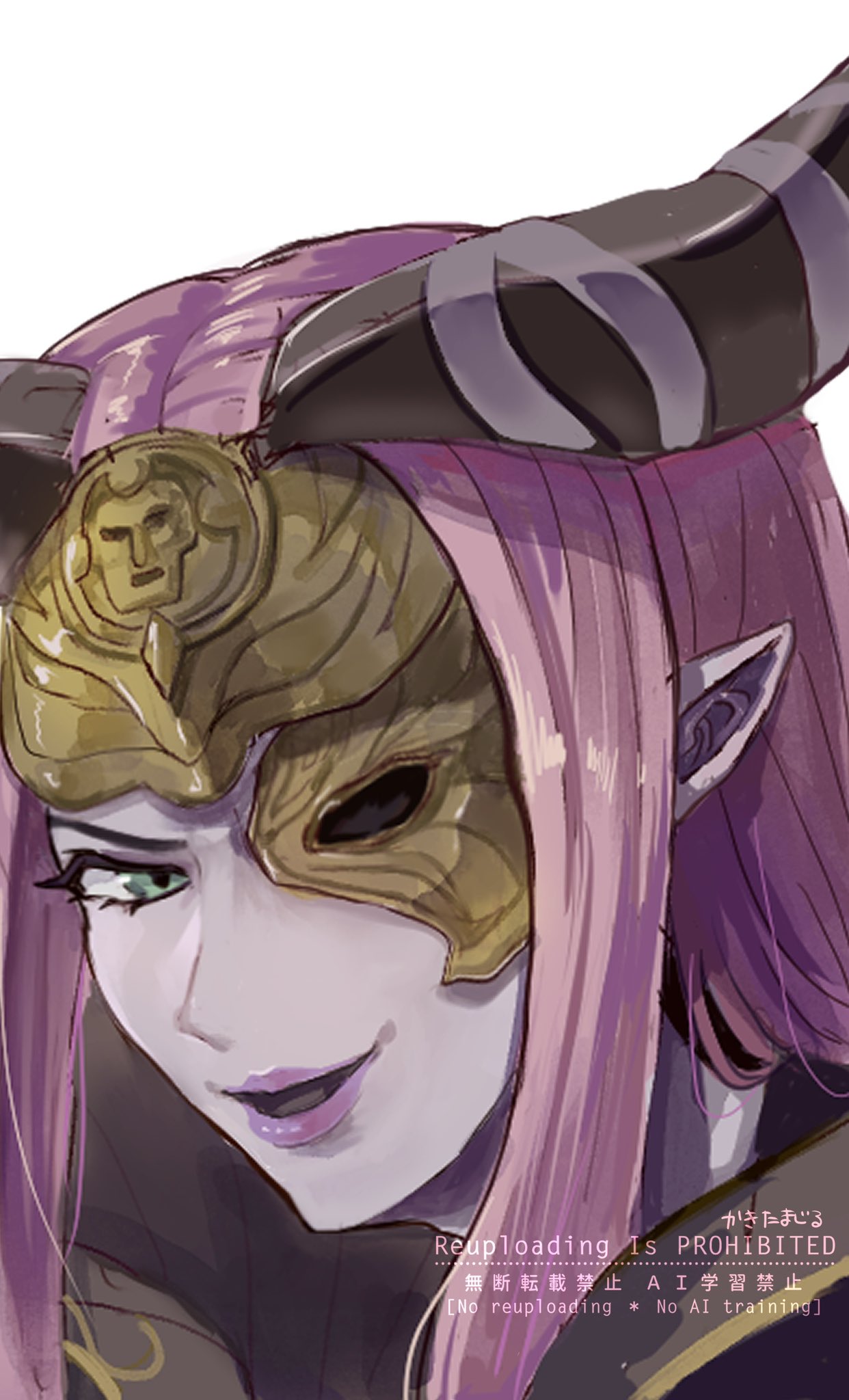 1girl fire_emblem fire_emblem_echoes:_shadows_of_valentia fire_emblem_gaiden green_eyes highres horns kakitamajiru_23 lipstick makeup mask nintendo nuibaba purple_hair solo tagme watermark