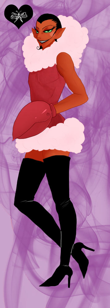 1boy black_eyes black_hair black_shoes boots colored_sclera colored_skin commentary crab_claw demon demon-of-misfortune demon_boy dress evil_grin evil_smile facial_hair fur_trim goatee green_sclera grin hair_slicked_back heart high_heel_boots high_heels him_(powerpuff_girls) looking_at_viewer male_focus pink_fur pointy_ears powerpuff_girls purple_background red_dress red_skin shoes short_hair skin_tight smile standing thigh_boots widow's_peak