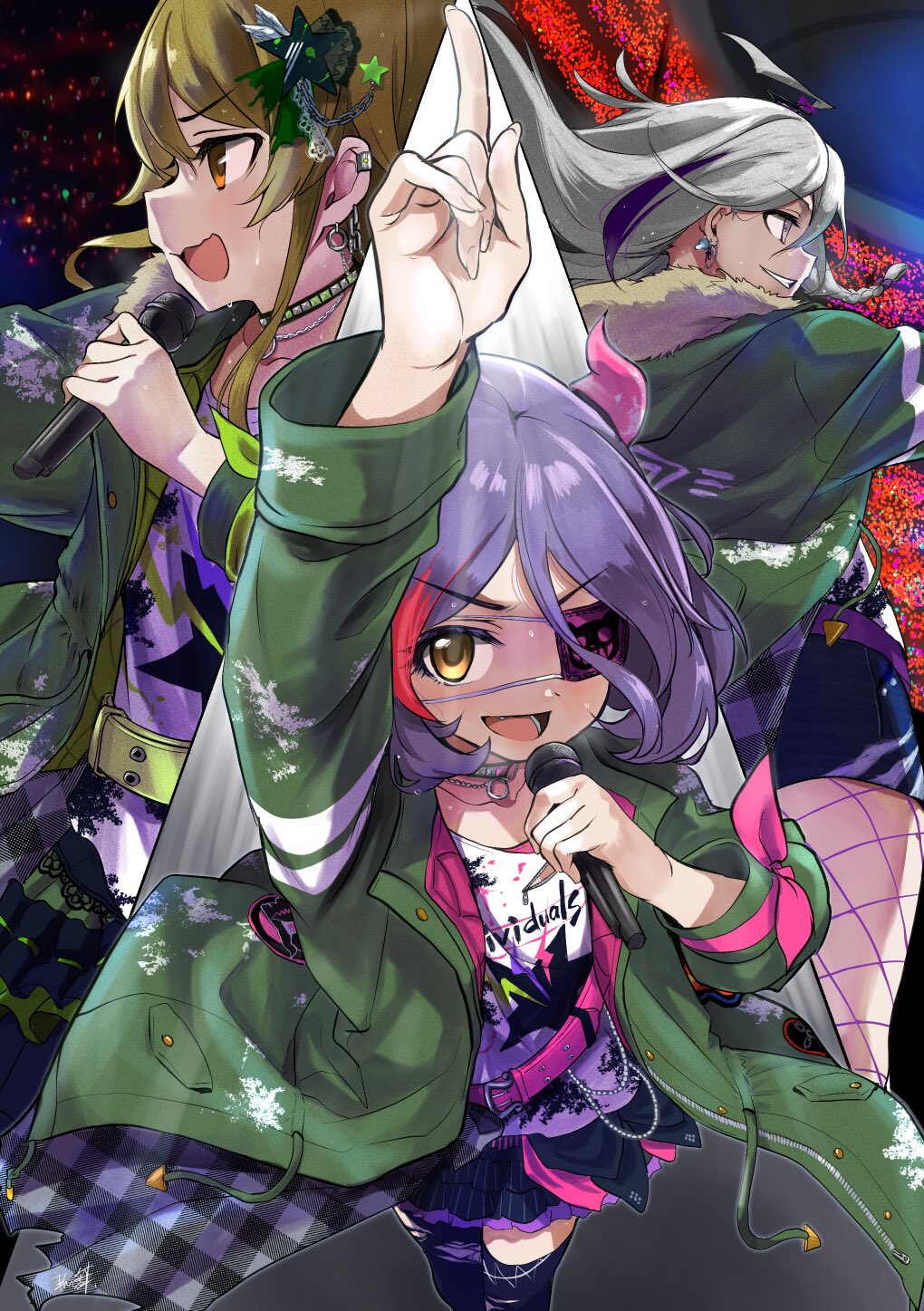 3girls brown_eyes choker ear_piercing eyepatch fake_horns grey_hair hair_ornament hayasaka_mirei highres holding holding_microphone horns hoshi_syoko idolmaster idolmaster_cinderella_girls idolmaster_cinderella_girls_starlight_stage individuals_(idolmaster) jacket kirikirimai_(kkm) microphone morikubo_nono multiple_girls music official_alternate_costume open_clothes open_jacket out_of_frame outstretched_arms perspective piercing pointing pointing_up singing skirt smile