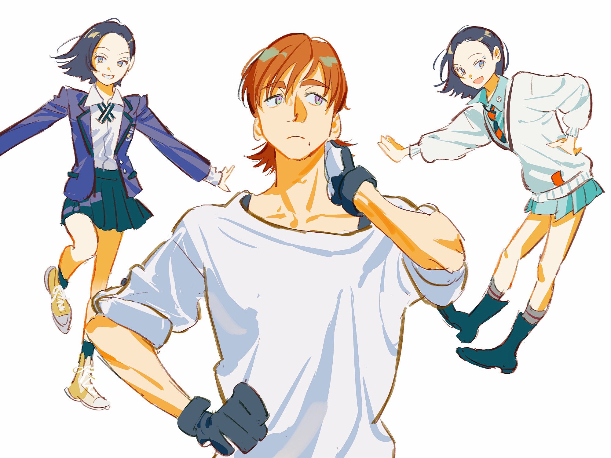 1boy 1girl amate_yuzuriha amate_yuzuriha_(cosplay) black_hair blue_eyes brown_hair collared_shirt comoli_harcourt cosplay gloves green_eyes gundam gundam_gquuuuuux highres jacket long_sleeves mole mole_under_eye mole_under_mouth multiple_views necktie nyaan_(gundam_gquuuuuux) nyaan_(gundam_gquuuuuux)_(cosplay) open_mouth purple_eyes school_uniform shirt shoes shuji_ito shuji_ito_(cosplay) skirt smile sweater tkrkve43 xavier_olivette