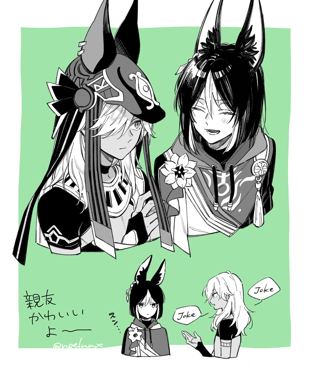 2boys :d ^_^ ancient_egyptian_clothes animal_ear_fluff animal_ears animal_hat artist_name blunt_ends bob_cut border choker closed_eyes closed_mouth commentary commentary_request crop_top cyno_(genshin_impact) dark-skinned_male dark_skin drawstring earrings english_commentary expressionless fingerless_gloves flower fox_ears genshin_impact gloves green_background greyscale_with_colored_background hair_between_eyes hair_over_one_eye hand_up hat hat_ribbon highres hood hood_down hoodie jackal_ears jewelry jitome long_hair looking_at_another lower_teeth_only male_focus multicolored_hair multiple_boys multiple_views noelnnx one_eye_covered open_mouth outside_border parted_bangs ribbon shirt short_hair short_sleeves single_earring smile speech_bubble streaked_hair swept_bangs tassel teeth tighnari_(genshin_impact) translation_request twitter_username unamused upper_body usekh_collar white_border