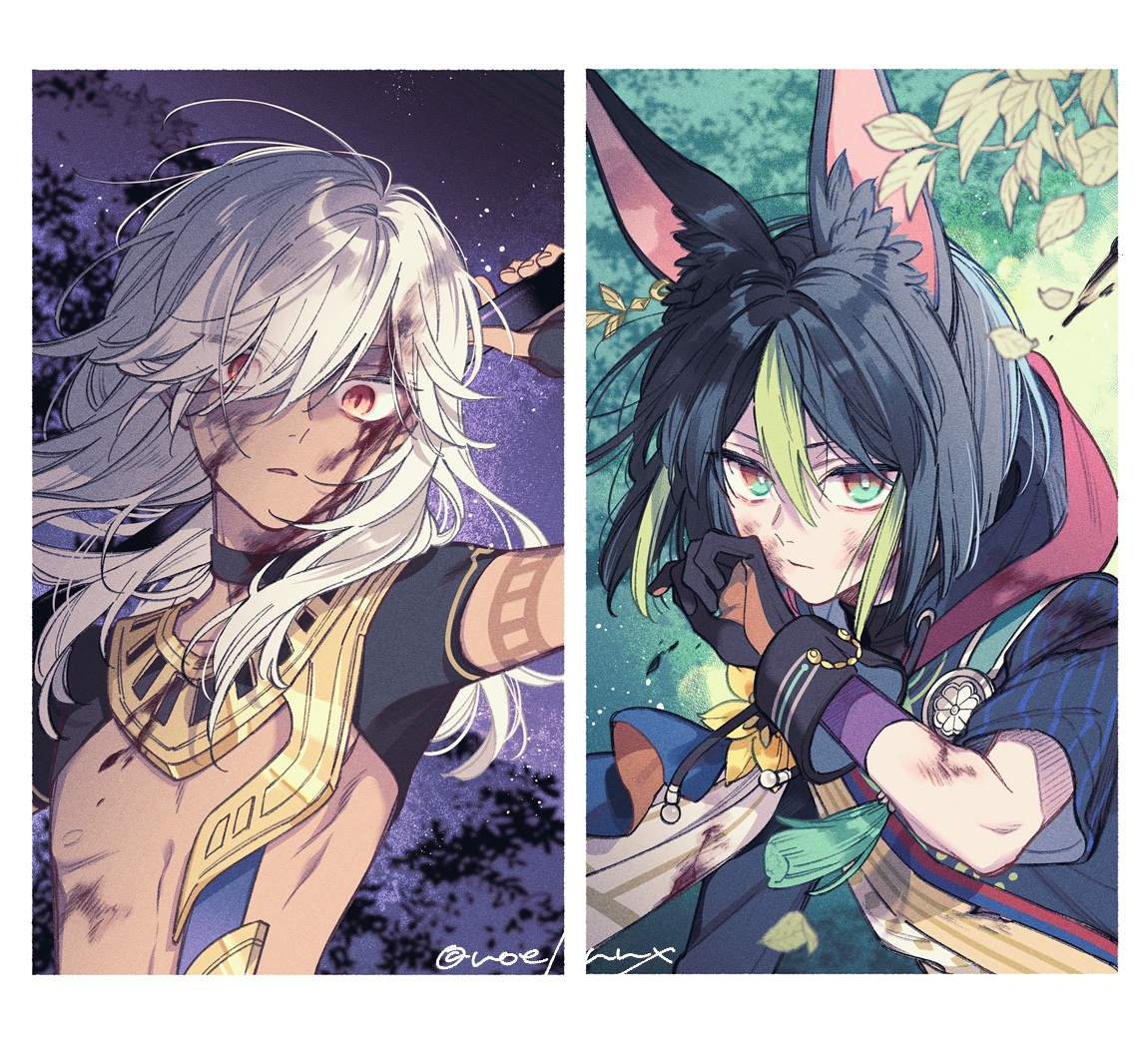 2boys ancient_egyptian_clothes animal_ear_fluff animal_ears arm_up artist_name black_choker black_gloves black_hair black_shirt bleeding blood blood_from_forehead blood_on_face blunt_bangs bob_cut border branch bright_pupils brown_eyes brown_gloves choker closed_mouth commentary crop_top cyno_(genshin_impact) dark-skinned_male dark_skin drawstring earrings eyes_visible_through_hair fingerless_gloves flower fox_ears genshin_impact gloves green_eyes green_hair hair_between_eyes hair_over_one_eye hand_up hood hood_down hoodie jewelry long_hair looking_at_viewer male_focus multicolored_eyes multicolored_hair multicolored_hoodie multiple_boys night noelnnx parted_bangs red_eyes serious shirt short_hair short_sleeves single_earring sky star_(sky) starry_sky streaked_hair swept_bangs untranslatable_commentary tassel tighnari_(genshin_impact) turtleneck twitter_username two-tone_gloves upper_body usekh_collar white_border white_hair white_pupils yellow_flower