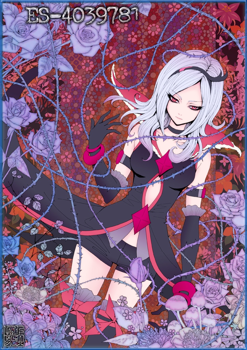 1girl bare_arms bare_shoulders black_cloak black_gloves bloom blue_flower blue_rose breasts brooch buttons cloak diamond-shaped_brooch diamond_button eas_(precure) eyelashes eyeliner floral_background flower fresh_precure! gloves grey_hair headband highres jewelry kamikita_futago long_hair makeup parted_bangs precure red_eyes red_ribbon ribbon rose shorts solo solo_focus standing throne wristband