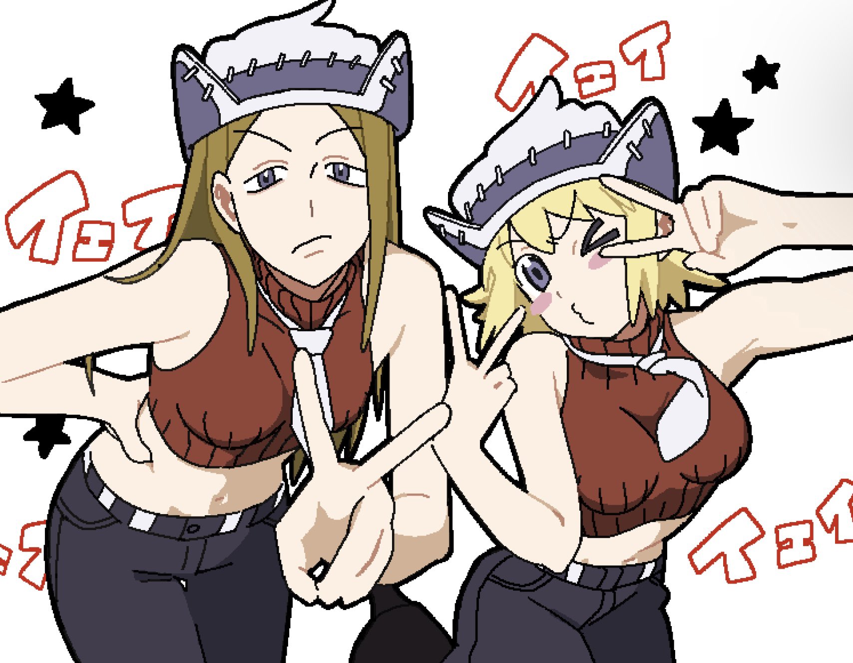 2girls blonde_hair commentary cowboy_shot crop_top double_v elizabeth_thompson hand_on_own_hip hat highres long_hair looking_at_viewer multiple_girls necktie one_eye_closed pants patricia_thompson red_shirt shirt short_hair siblings sisters sleeveless soul_eater star_(symbol) untranslatable_commentary ux_xu_o03 v white_necktie