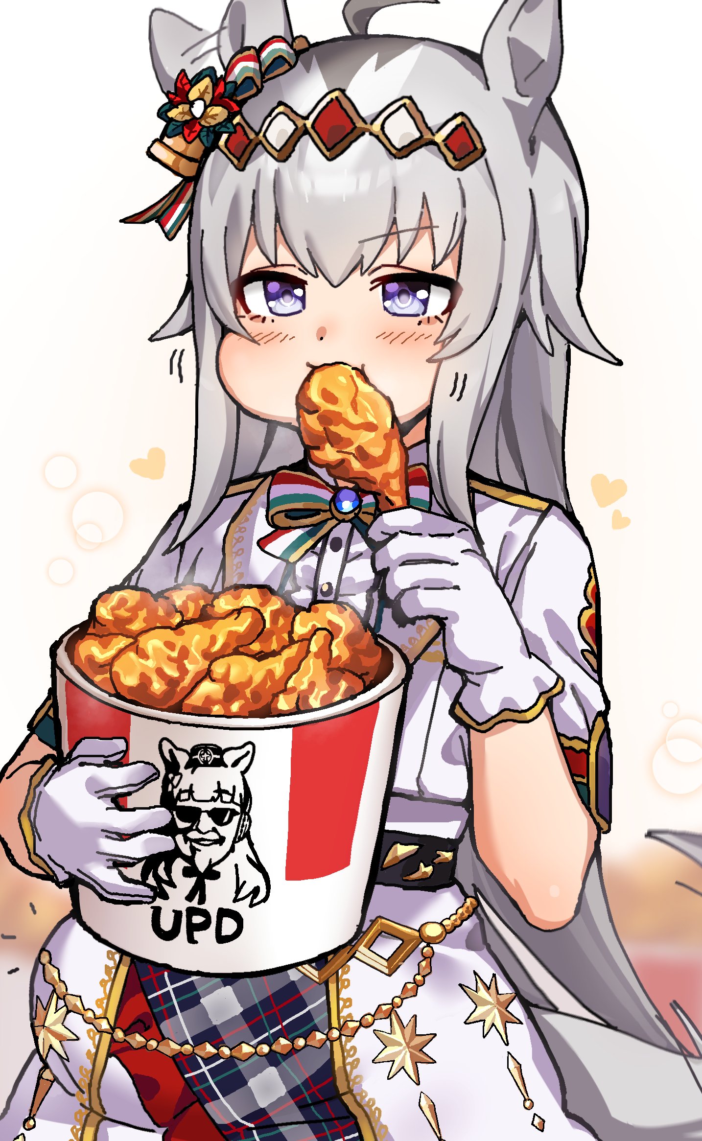 1girl ahoge animal_ears bell blue_eyes bow bowtie brooch bucket_of_chicken christmas commentary_request dress ear_wiggle gloves grey_hair hair_bell hair_ornament highres holding horse_ears horse_girl horse_tail jacket jewelry kfc long_hair looking_at_viewer official_alternate_costume oguri_cap_(ashen_miracle)_(umamusume) oguri_cap_(umamusume) ress_beep shirt short_dress short_sleeves simple_background solo sparkle tail umamusume white_background white_dress white_gloves white_jacket white_shirt