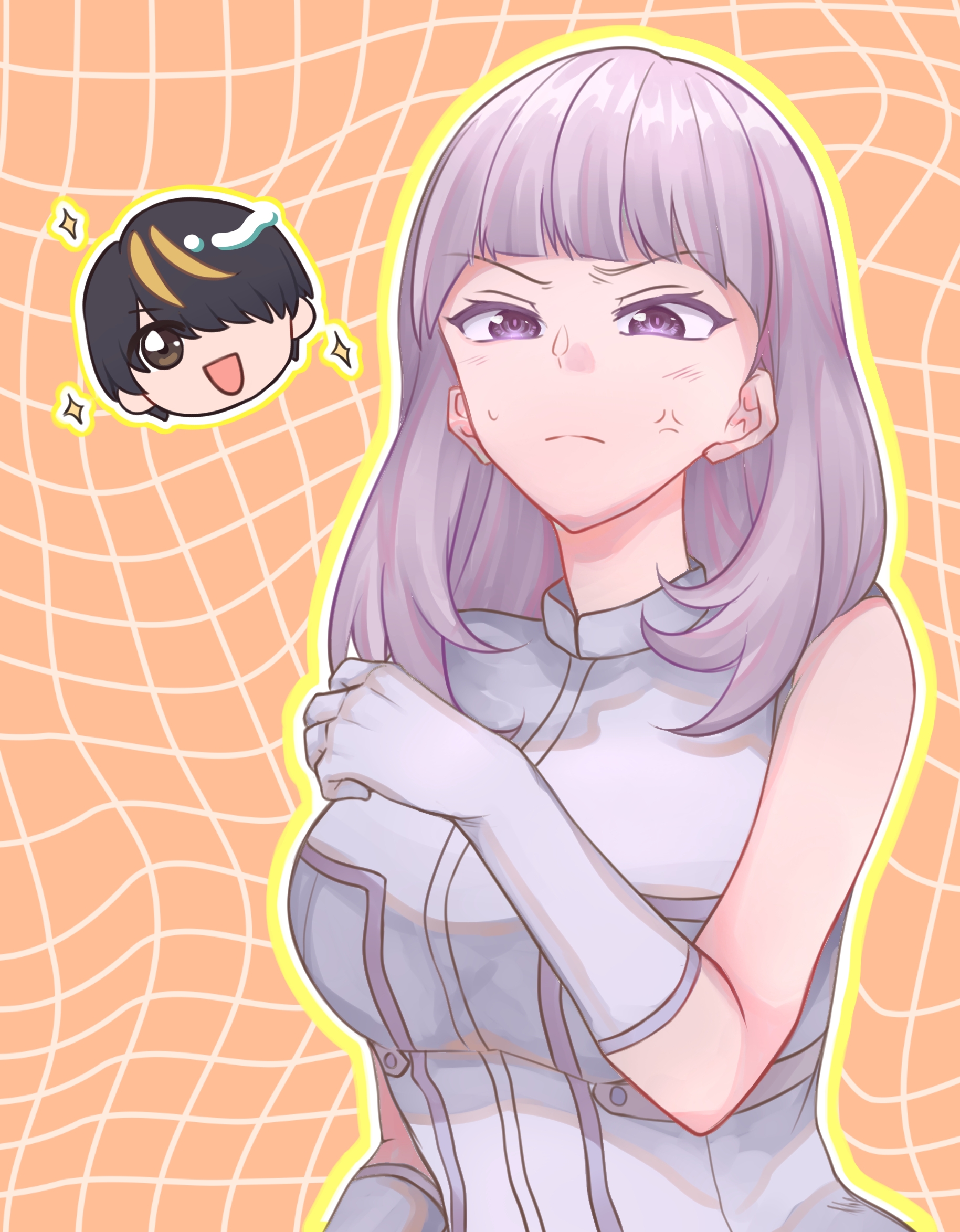 1boy 1girl angry black_hair blonde_hair brown_eyes chibi closed_mouth collared_shirt crossed_arms daraceriadestiasa gloves highres kurusu_yamato long_hair multicolored_hair open_mouth pink_eyes pink_hair sentai_daishikkaku shirt sleeveless sleeveless_shirt two-tone_hair white_gloves white_shirt yukino_angelica