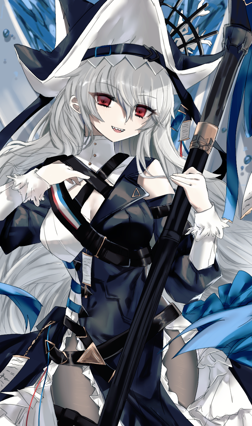 1girl air_bubble arknights belt belt_buckle black_dress black_hat black_pantyhose blue_ribbon breast_cutouts breasts bubble buckle clothing_cutout criss-cross_straps dress frills grey_hair hair_between_eyes hat high_collar highres hiyoko_(96823534) holding holding_polearm holding_weapon large_breasts long_hair long_sleeves looking_at_viewer open_mouth pantyhose pointy_hat polearm red_eyes red_ribbon ribbon sharp_teeth shoulder_cutout shoulder_strap solo specter_(arknights) specter_the_unchained_(arknights) teeth thighhighs thighs two-sided_fabric two-sided_headwear two-tone_dress underwear weapon