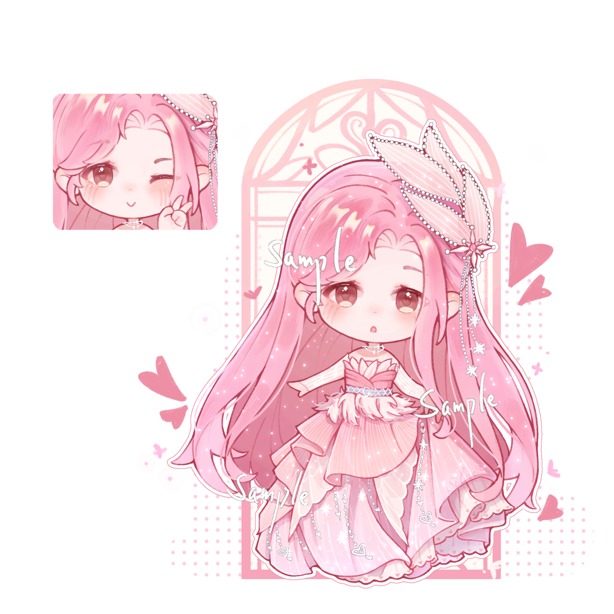 1girl :o ayayayai bare_shoulders beads bridal_gauntlets brown_eyes chibi chinese_commentary closed_mouth commentary_request dot_nose dress expressionless eyelashes fairytale_swan_(infinity_nikki) feather-trimmed_dress feather_hair_ornament feathers frilled_dress frills gown hair_beads hair_ornament halftone happy heart highres holding_own_dress infinity_nikki jewelry lace_bridal_gauntlets light_blush light_particles long_dress long_hair long_sidelocks looking_at_viewer necklace nikki_(nikki) nikki_(series) one_eye_closed open_mouth outline parted_bangs pink_dress pink_hair procreate_(medium) sample_watermark sidelocks smile stained_glass standing strapless strapless_dress striped_clothes striped_dress v vertical-striped_clothes vertical-striped_dress very_long_hair watermark white_background white_bridal_gauntlets white_outline