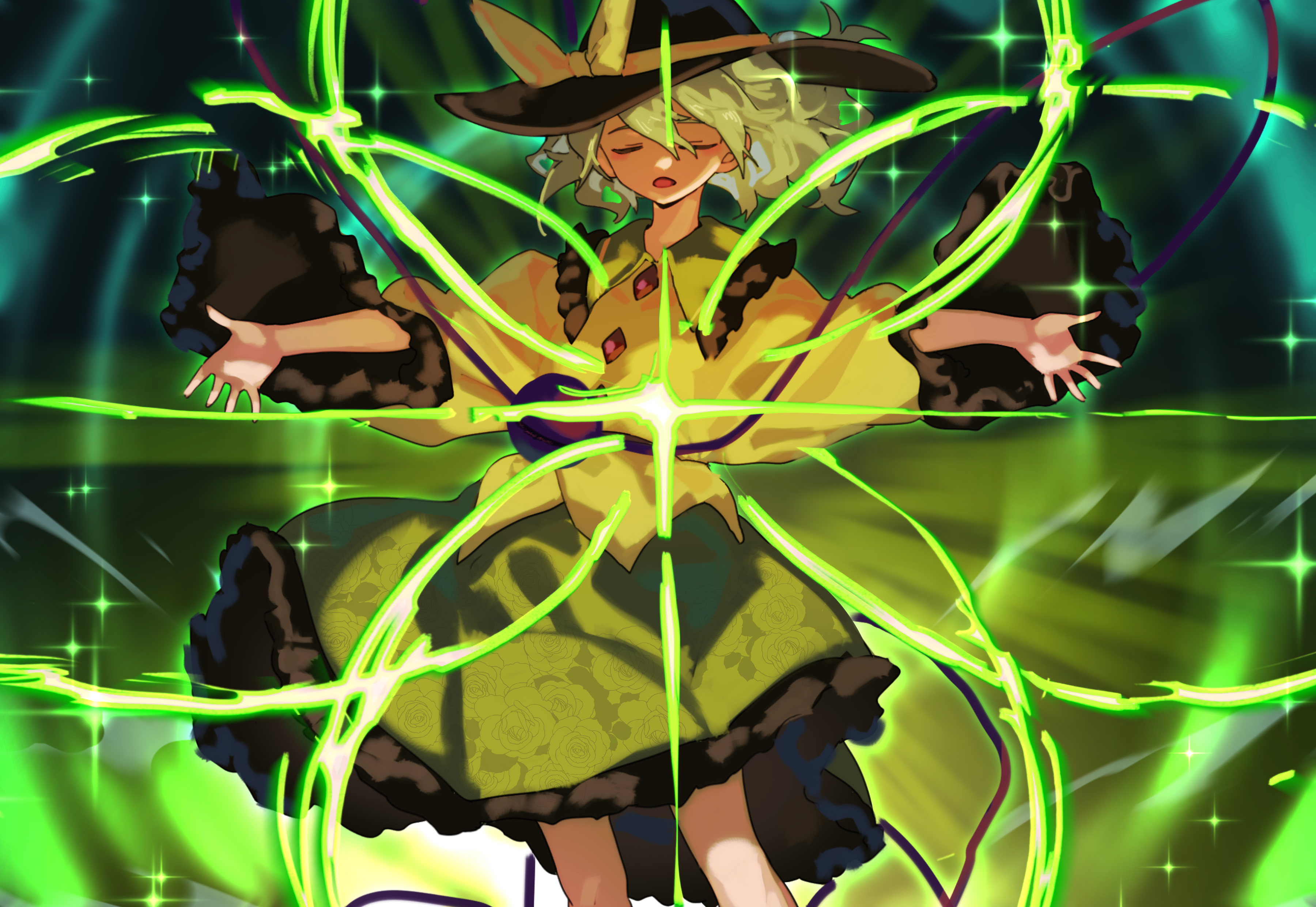 1girl absurdres black_hat blouse bow buttons closed_eyes danmaku diamond_button eyeball flower_symbol frilled_shirt_collar frilled_sleeves frills green_hair green_skirt green_theme hat hat_bow highres komeiji_koishi open_mouth shirt short_hair skirt third_eye touhou tuck_(tuck23978434) wide_sleeves yellow_bow yellow_shirt