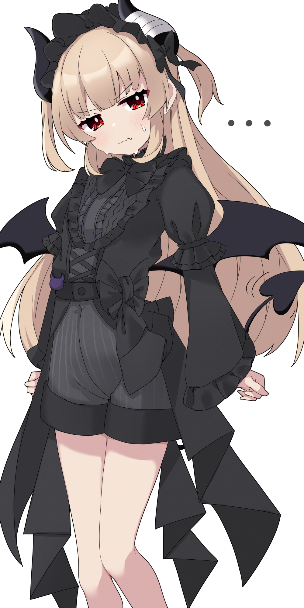 1girl amai_nekuta blonde_hair blush closed_mouth demon_girl demon_horns demon_tail demon_wings hairband highres horns long_hair long_sleeves looking_at_viewer natori_sana natori_sana_(devil_natori) red_eyes sana_channel shorts simple_background solo sweatdrop tail two_side_up virtual_youtuber white_background wings