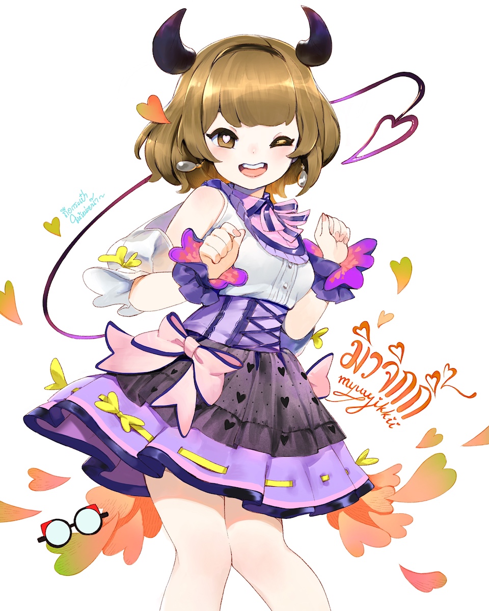 1girl bare_legs bare_shoulders black-framed_eyewear black_hairband black_horns black_skirt bnk48 bow skirt_bow bowtie bright_pupils brown_eyes brown_hair buttons character_name clenched_hands collared_shirt commentary corset cowboy_shot demon_girl demon_horns demon_tail detached_horns detached_sleeves dot_nose dress_shirt earrings english_commentary eyelashes fingernails floating_clothes floating_earrings frilled_shirt frilled_skirt frilled_sleeves frilled_wrist_cuffs frills glasses hairband happy heart heart-shaped_pupils heart_print highres horns jewelry knees light_blush looking_at_viewer medium_hair miniskirt one_eye_closed open_mouth patipat_asavasena pink_bow pink_bowtie pink_nails pleated_skirt puffy_short_sleeves puffy_sleeves purple_corset purple_wrist_cuffs red_tail ribbon-trimmed_skirt ribbon_trim round_eyewear shirt short_sleeves single_stripe skirt sleeveless sleeveless_shirt smile solo standing striped_bow striped_bowtie striped_clothes symbol-shaped_pupils tail teeth unworn_eyewear upper_teeth_only white_background white_pupils white_shirt white_sleeves wrist_cuffs