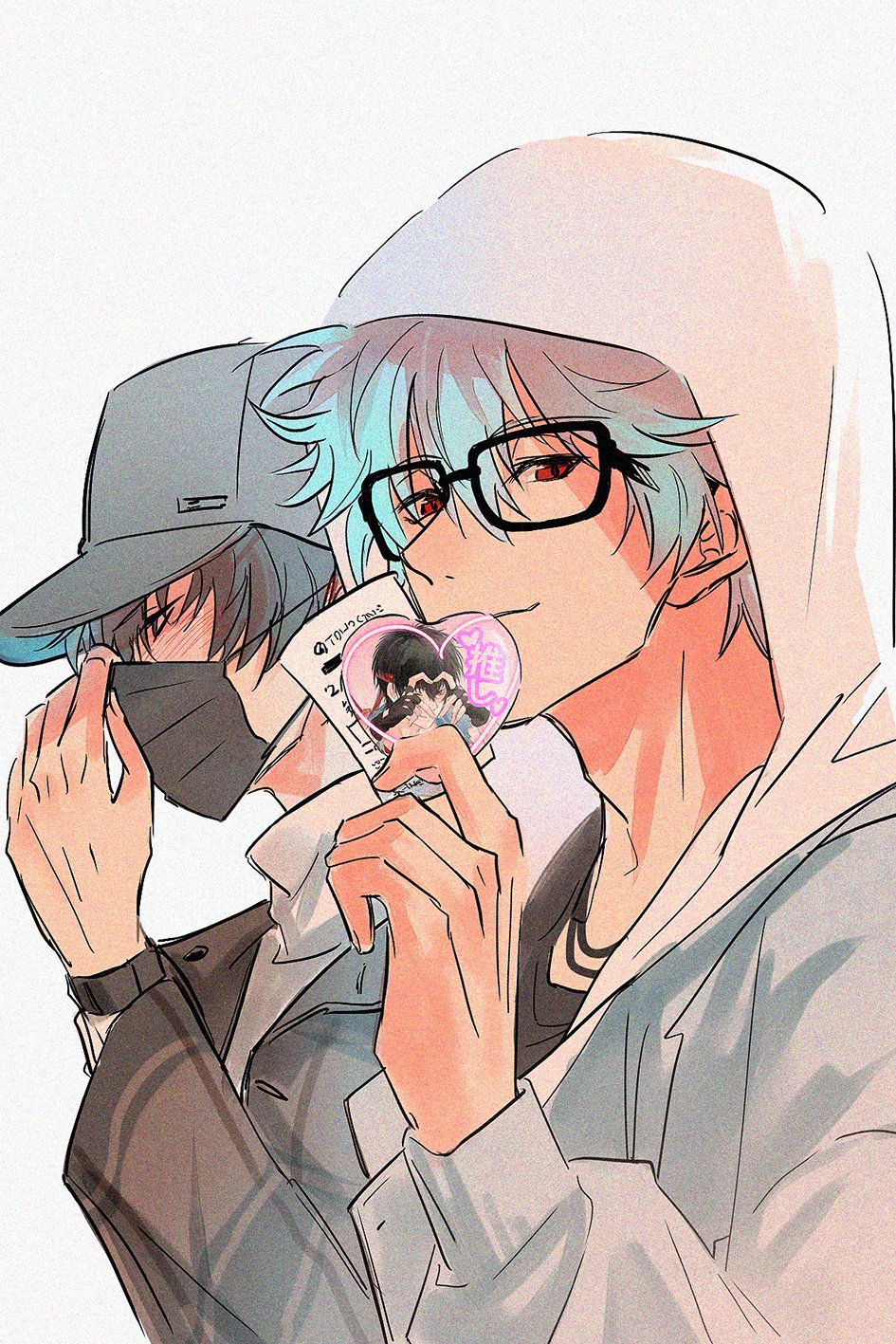 2boys arm_up baseball_cap bespectacled black-framed_eyewear black_hair black_hat black_shirt commentary_request elninono1 gintama glasses hair_between_eyes hat highres hijikata_toushirou holding hood hood_up hoodie jacket layered_clothes long_sleeves looking_to_the_side male_focus mask mask_pull mouth_mask multiple_boys red_eyes sakata_gintoki shirt short_hair sideways_glance simple_background smile turtleneck upper_body white_background white_hair white_hoodie white_shirt