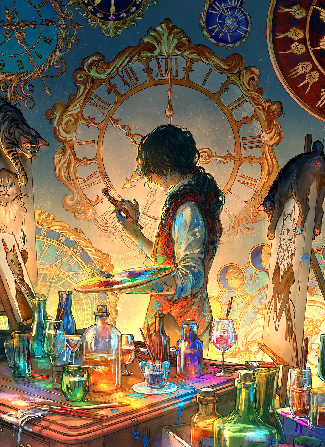 1boy artist_name black_cat black_hair bottle canvas_(object) cat cat_request clock commentary cork cup curly_hair dante_(yuumei) drinking_glass easel english_commentary feet_out_of_frame from_side green_eyes hand_up highres holding holding_paint_palette holding_paintbrush long_hair looking_at_viewer low_ponytail nose original paint_on_body paint_on_clothes paint_palette paintbrush ponytail red_vest shirt solo three-quarter_sleeves vest white_shirt wine_glass yuumei
