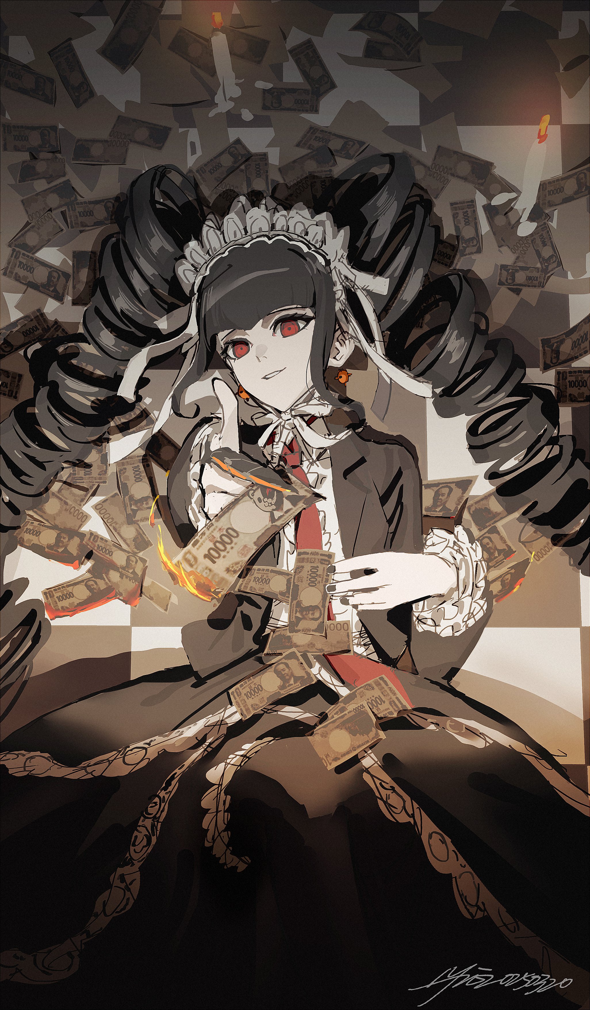 1girl absurdres banknote black_hair black_jacket black_nails black_skirt blazer burning candle celestia_ludenberg center_frills checkered_floor collared_shirt danganronpa:_trigger_happy_havoc danganronpa_(series) drill_hair earrings fire frilled_sleeves frills gothic_lolita hair_ribbon hairband highres hua_ze_you jacket jewelry lolita_fashion lolita_hairband long_hair long_sleeves money monokuma necktie on_floor outstretched_arm pale_skin parted_lips red_eyes red_necktie ribbon shirt sidelocks signature skirt solo twin_drills very_long_hair white_ribbon white_shirt