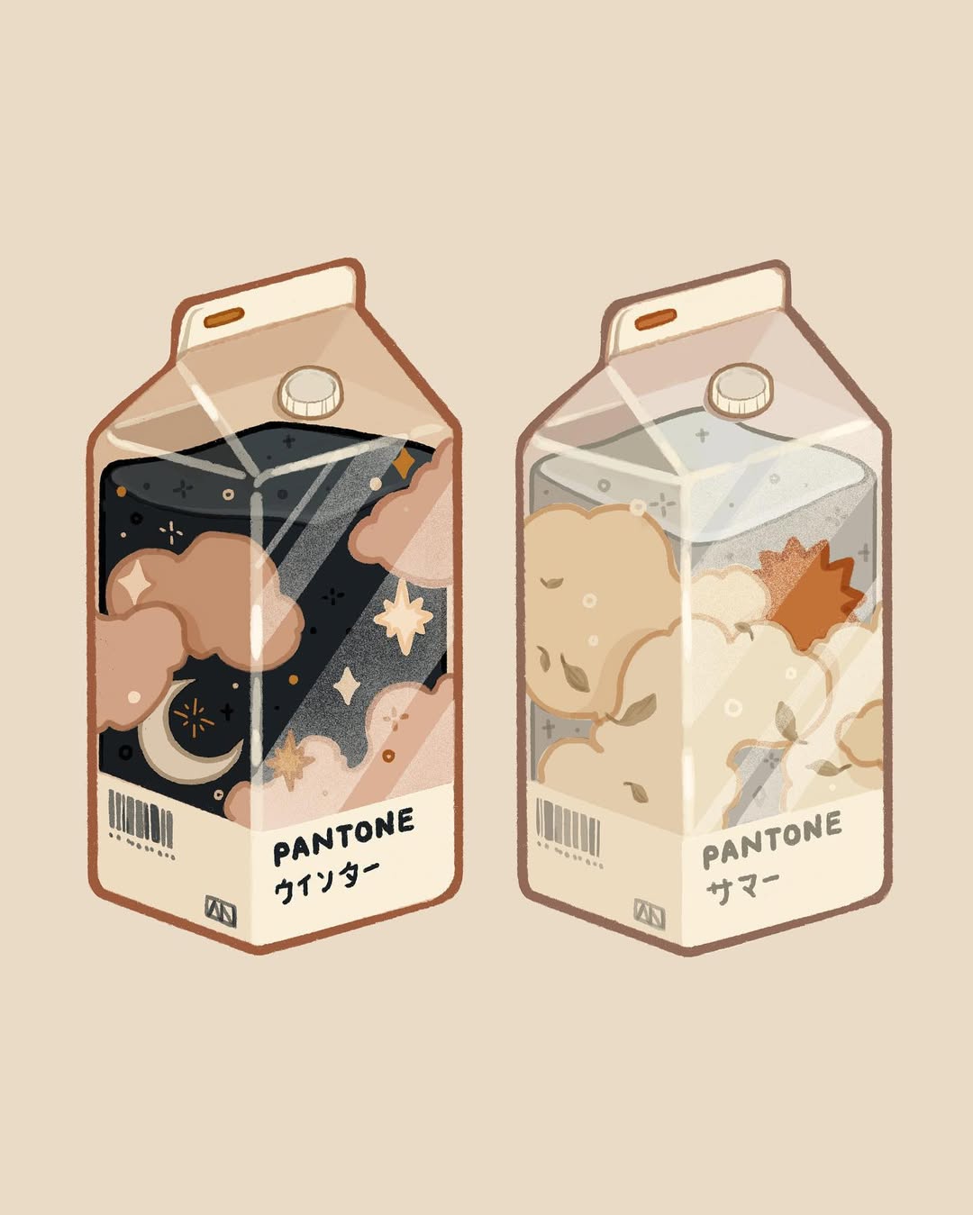 angie_nguyen barcode cloud commentary crescent_moon day drink_carton english_commentary food_focus grey_background highres juice_box moon night no_humans original simple_background sparkle sun