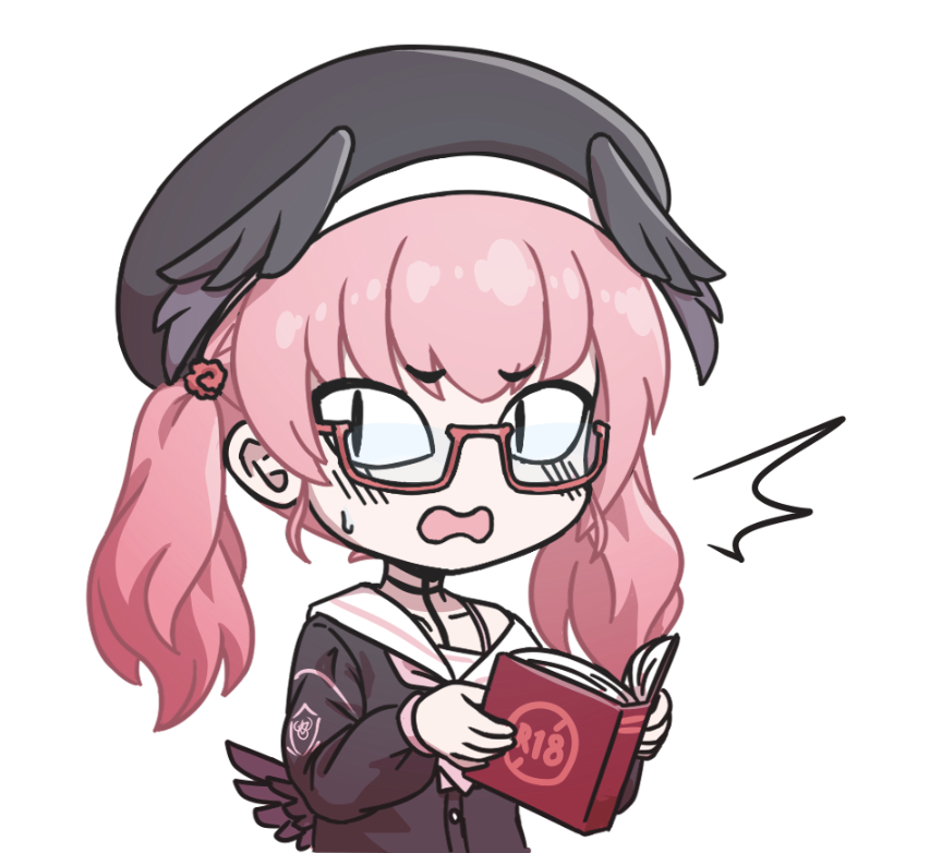 beret blue_archive blush book chibi delta_r9 glasses hair_wings hat holding holding_book koharu_(blue_archive) pink_hair sailor_collar twintails wings