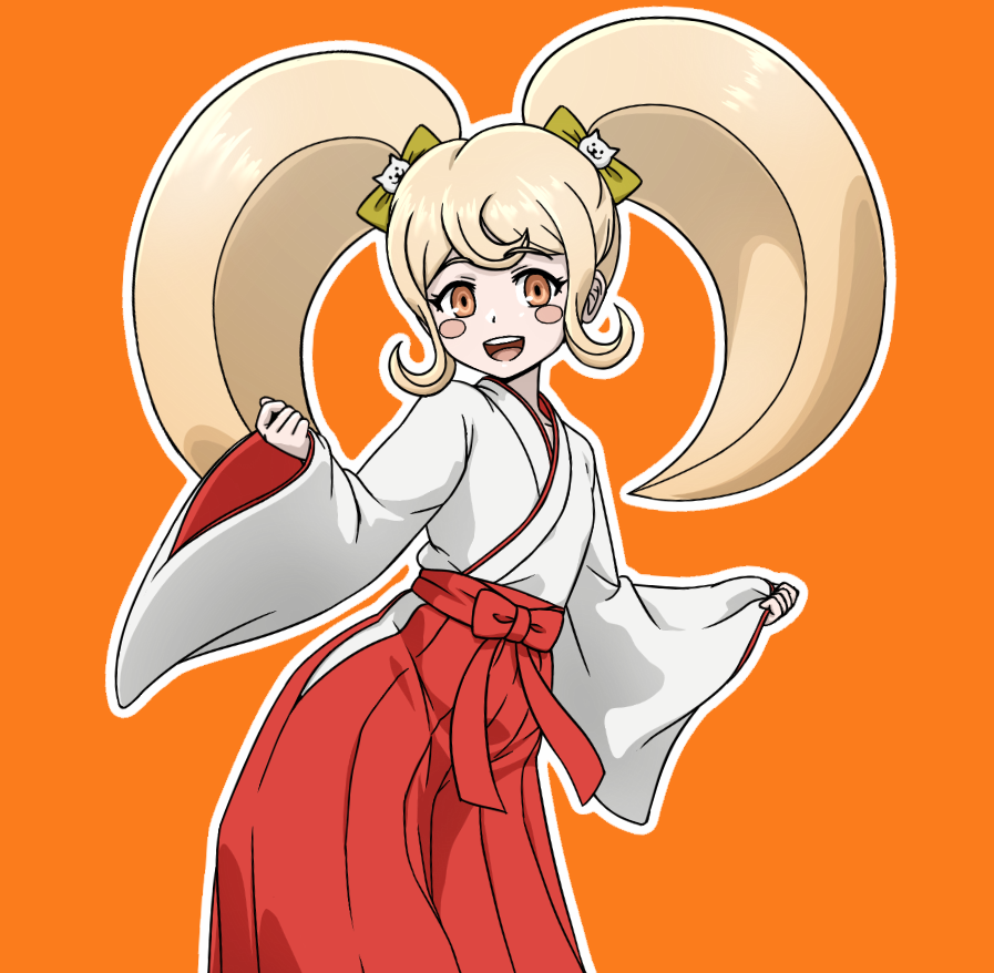 blonde_hair danganronpa_(series) danganronpa_2:_goodbye_despair delta_r9 green_ribbon japanese_clothes miko orange_background orange_eyes ribbon saionji_hiyoko smile twintails