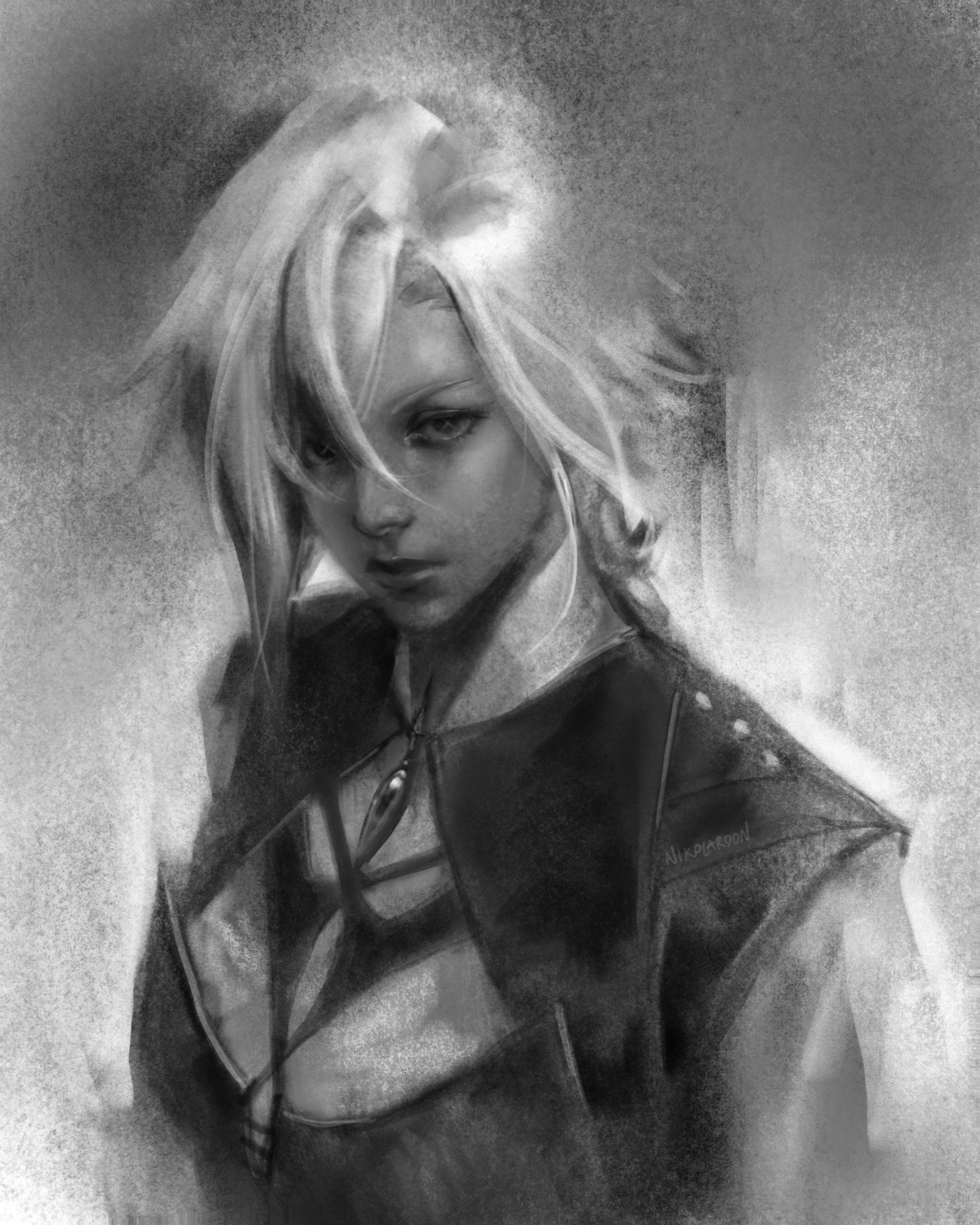 1girl arlecchino_(genshin_impact) artist_name breasts brooch closed_mouth coat commentary english_commentary genshin_impact grey_background hair_between_eyes highres jewelry looking_to_the_side medium_breasts monochrome nikolas_(nikolardon) portrait realistic short_hair solo unfinished white_hair