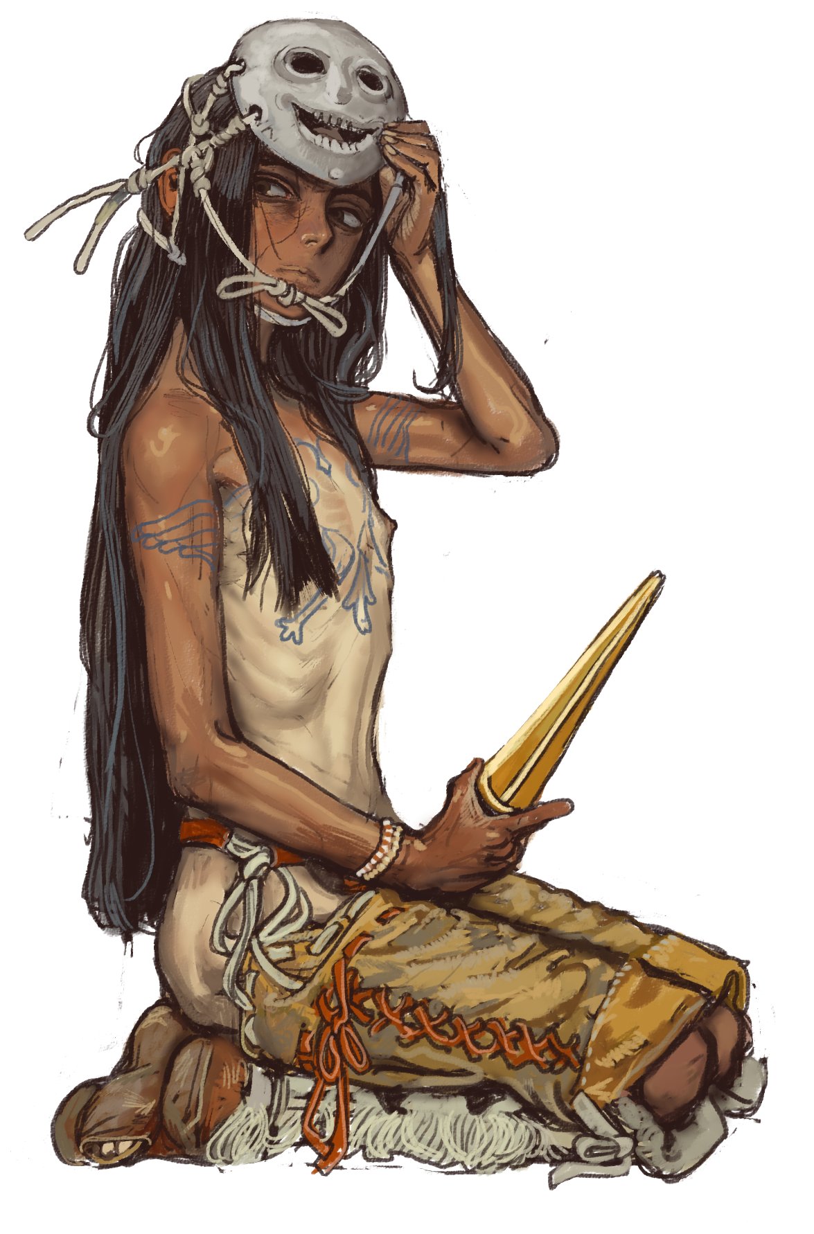 1boy aged_down androgynous backless_pants bishounen black_hair bodypaint bracelet brown_eyes brown_pants chaps emperor_of_mankind expressionless highres holding holding_weapon jewelry kneeling laurel_crown loincloth long_hair male_focus mask mask_on_head mossacannibalis nipples pants simple_background skinny solo tan tanline thick_eyebrows topless_male very_long_hair warhammer_40k weapon white_background