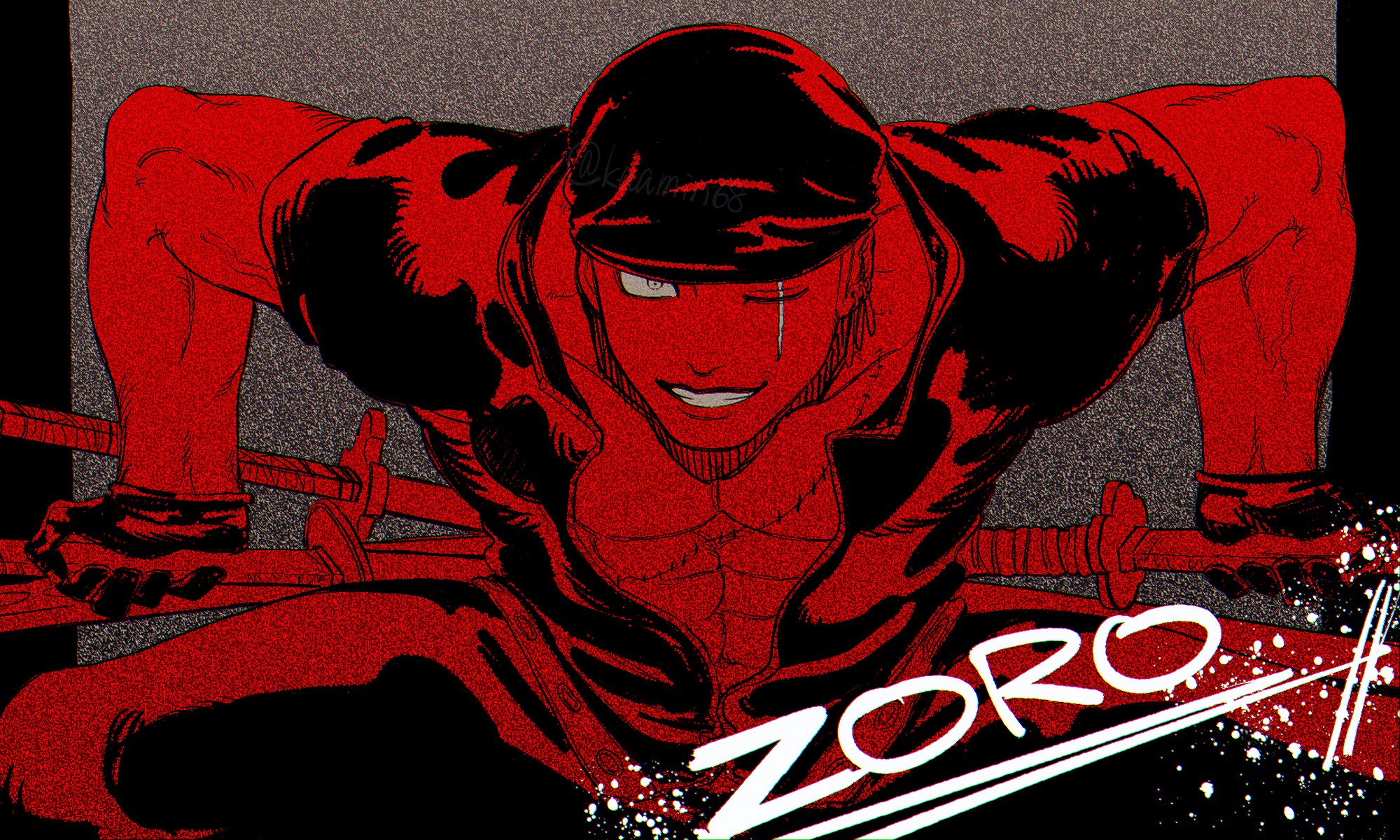1boy abs bandana commentary_request gloves highres holding holding_sword holding_weapon larugo0513 looking_at_viewer male_focus one_piece red_theme roronoa_zoro scar scar_across_eye scar_on_face short_sleeves smile solo stitched_torso stitches sword weapon