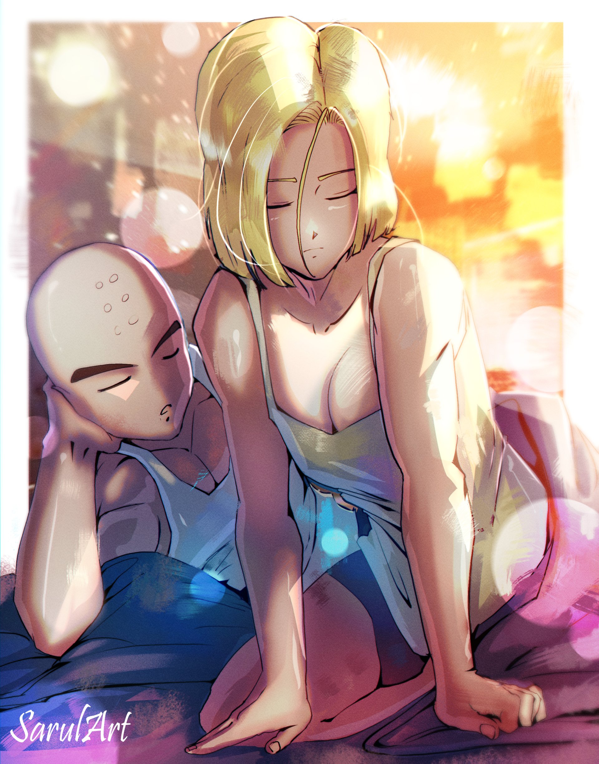 1boy 1girl absurdres android_18 bald bald_male blonde_pubic_hair breasts cleavage closed_eyes couple dragon_ball highres husband_and_wife kuririn morning muscular muscular_male pubic_hair sarulart