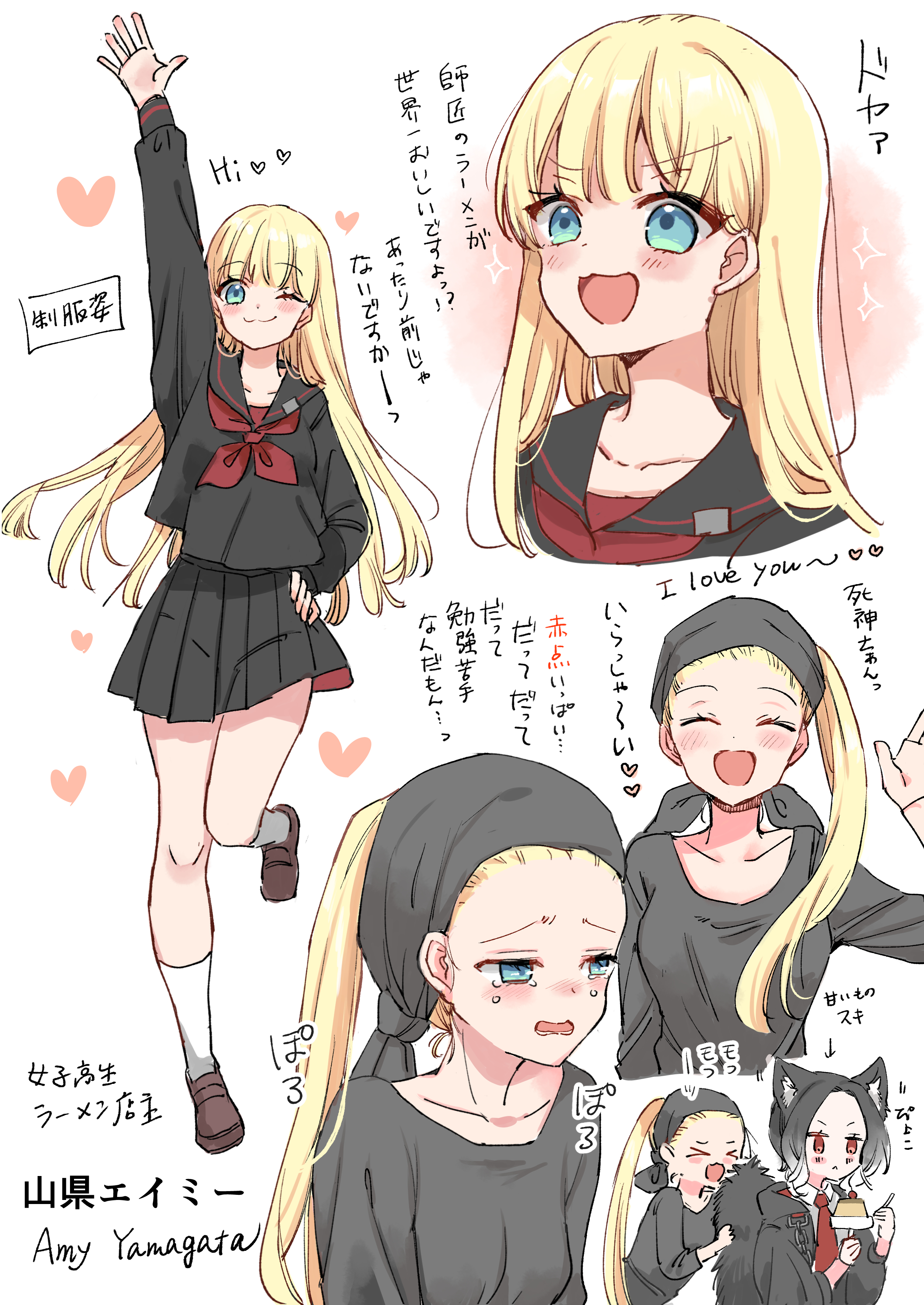>_< 1girl :d ;) ^_^ absurdres animal_ear_fluff animal_ears arm_up arrow_(symbol) black_hair black_jacket black_sailor_collar black_serafuku black_shirt black_skirt blonde_hair blue_eyes blush brown_shoes closed_eyes closed_mouth collarbone collared_shirt dog_ears dog_girl dog_tail food forehead gradient_hair half-closed_eyes headscarf heart highres holding hood hood_down hooded_jacket jacket loafers long_hair long_sleeves mito_(go!go!king!) multicolored_hair multiple_views neckerchief necktie one_eye_closed open_clothes open_jacket open_mouth original parted_bangs pleated_skirt pudding puffy_long_sleeves puffy_sleeves red_neckerchief red_necktie sailor_collar school_uniform serafuku shinigami shirt shoes skirt smile socks tail tears translation_request v-shaped_eyebrows very_long_hair white_background white_hair white_shirt white_socks xd