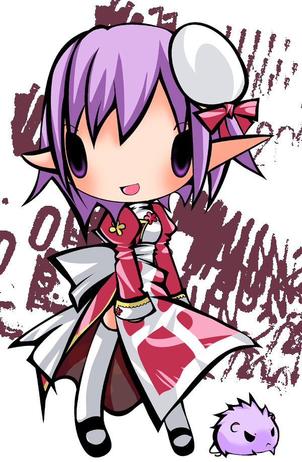 1girl 2000s_(style) :d back_bow black_shoes blush bow chibi chibi_only commentary_request dated dress full_body hat hat_bow high_priest_(ragnarok_online) juliet_sleeves long_sleeves looking_at_viewer mary_janes mouse_(animal) open_mouth pointy_ears puffy_sleeves purple_eyes purple_hair ragnarok_online red_dress sailor_hat sash shoes short_hair smile solid_oval_eyes solo tarou_(ragnarok_online) thighhighs two-tone_dress white_background white_bow white_dress white_hat white_sash white_thighhighs yu_(lilacxx)