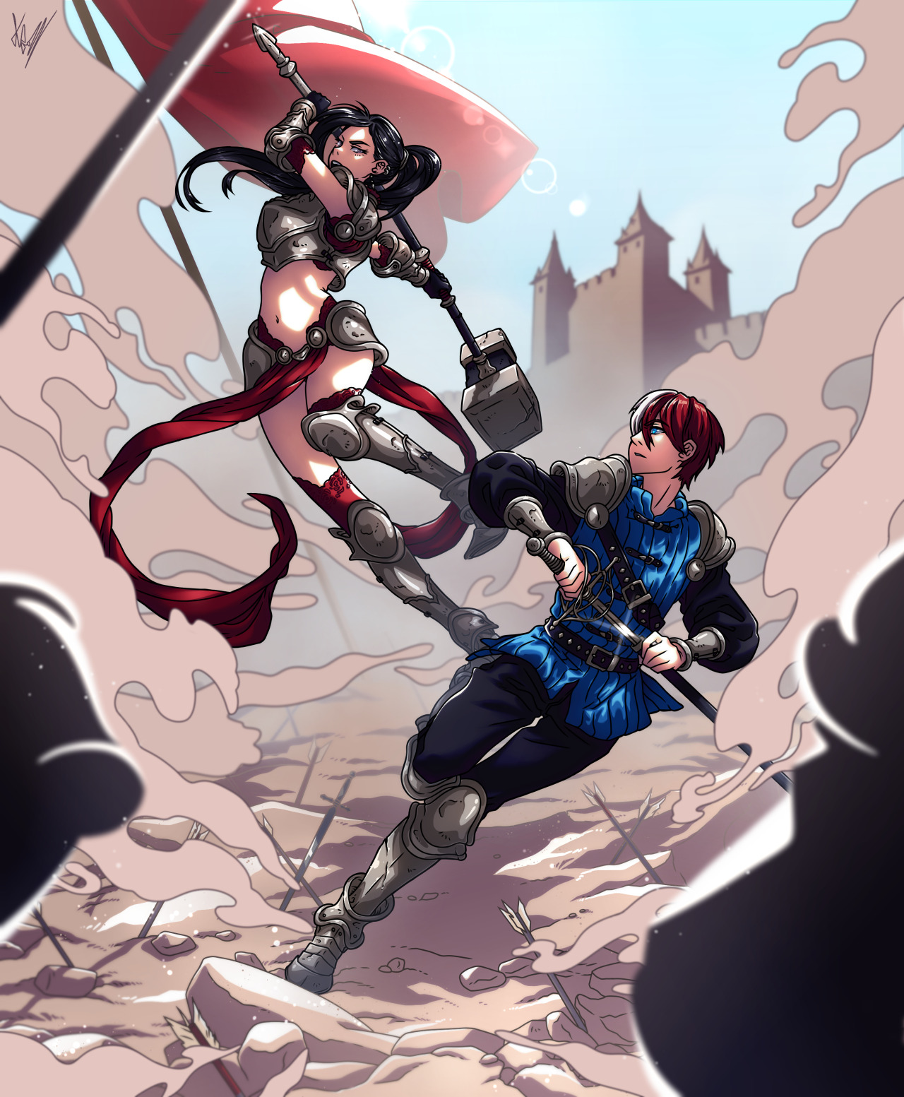 1boy 1girl boku_no_hero_academia_2nd_popularity_poll alternate_costume armor arrow_(projectile) artist_request bikini_armor black_hair blue_eyes boku_no_hero_academia castle hammer hanaby_3 highres midriff multicolored_hair navel pants pelvic_curtain ponytail rapier shoulder_armor smoke sword tagme thighhighs todoroki_shoto weapon yaoyorozu_momo
