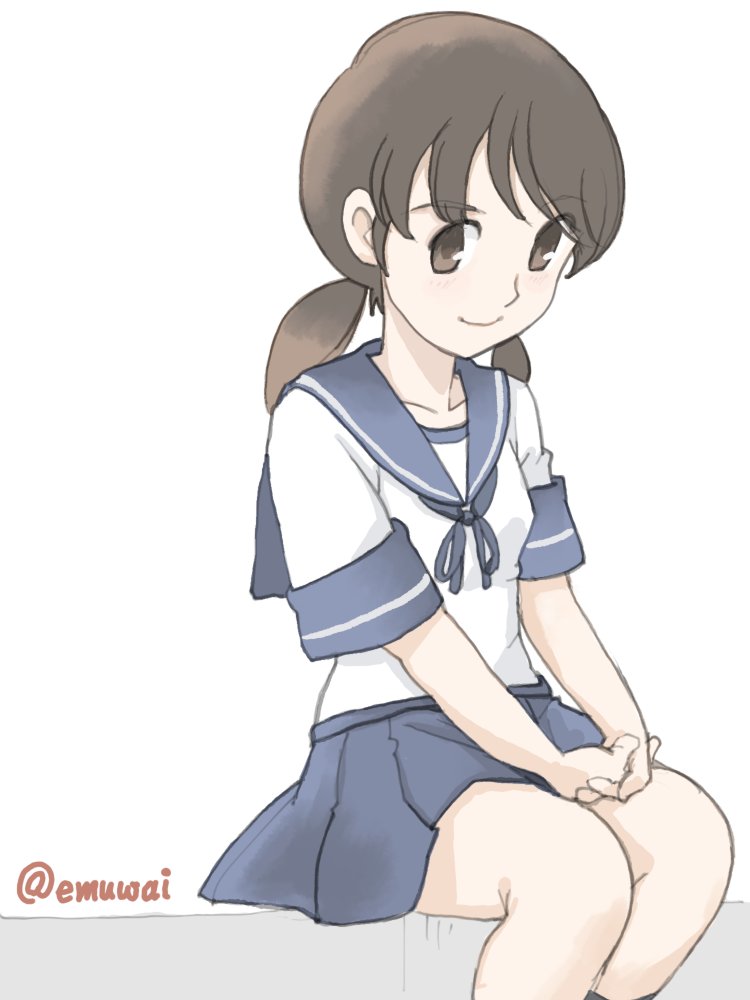 1girl blue_sailor_collar blue_skirt brown_eyes brown_hair emuwai feet_out_of_frame kantai_collection low_twintails medium_hair one-hour_drawing_challenge pleated_skirt sailor_collar sailor_shirt school_uniform serafuku shirayuki_(kancolle) shirt simple_background skirt solo twintails twitter_username white_background