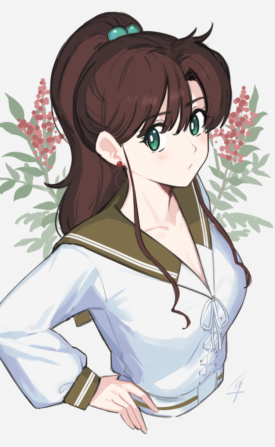 1girl bishoujo_senshi_sailor_moon brown_hair collarbone flower green_eyes green_sailor_collar hair_bobbles hair_ornament hayabusa_(vert_320) highres kino_makoto kino_makoto's_school_uniform long_hair looking_at_viewer ponytail sailor_collar school_uniform sidelocks solo