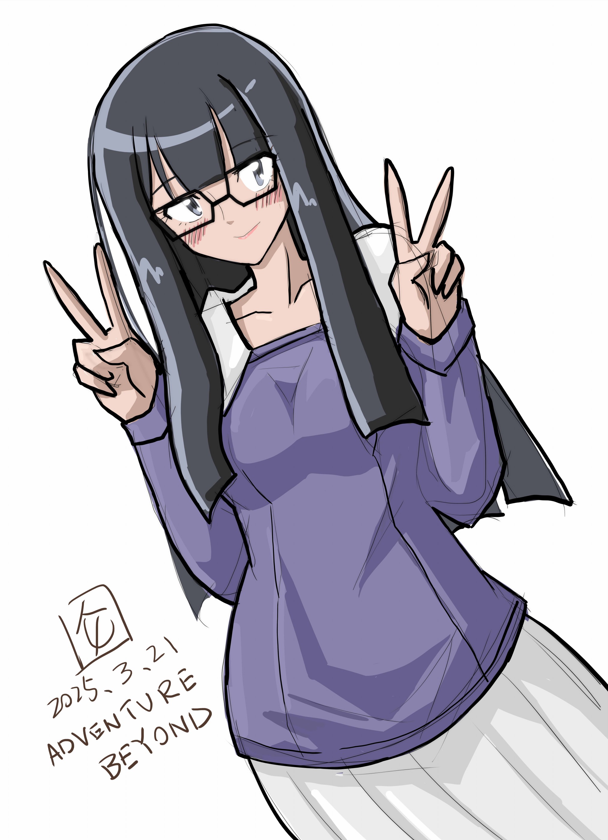 absurdres black_hair blue_shirt copyright_name cowboy_shot curry_lun dated digimon digimon_adventure_-beyond- double_v glasses highres long_hair mochizuki_meiko shirt simple_background skirt v white_background white_skirt