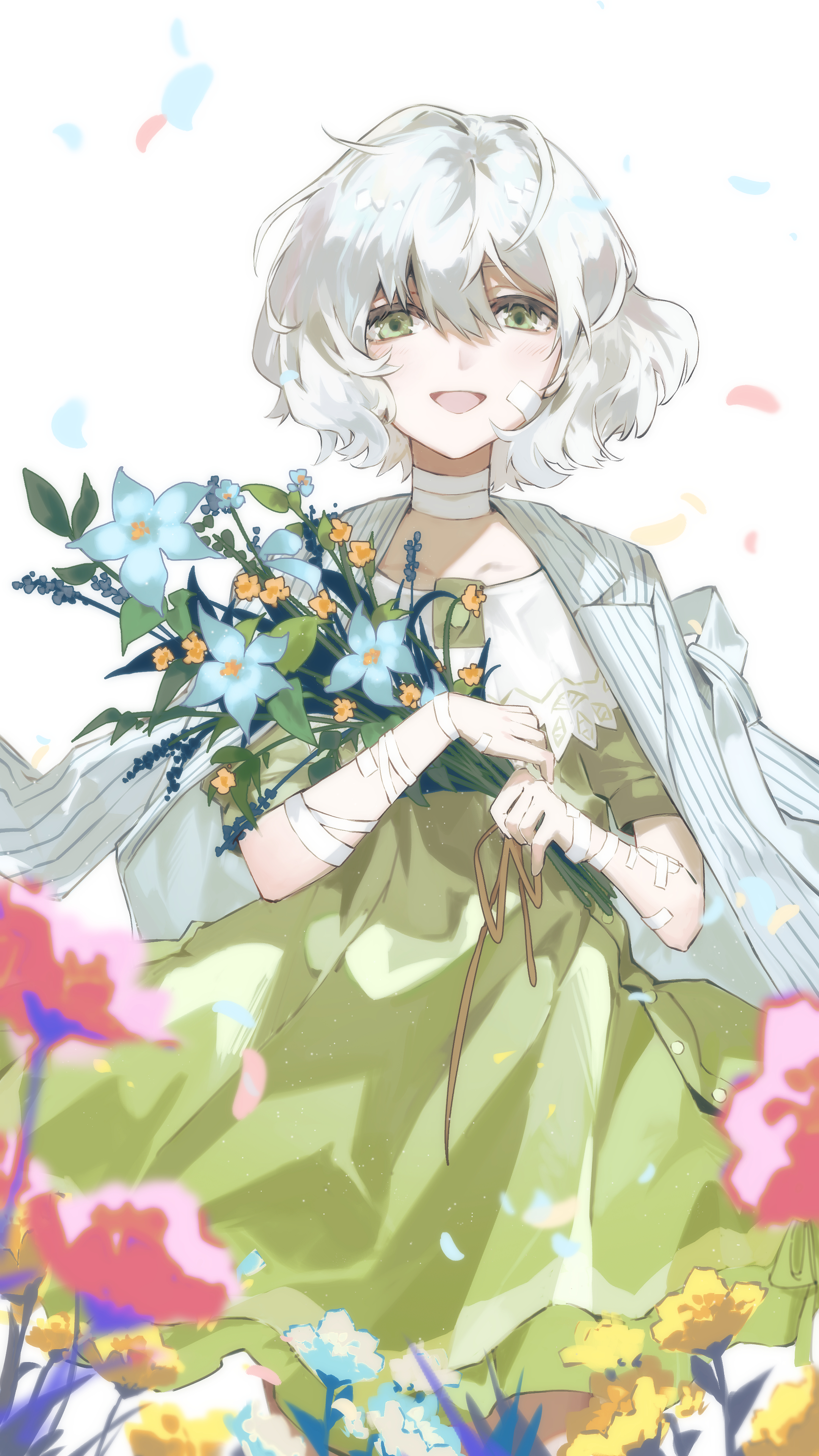 1girl :d absurdres bandaged_neck bandages bandaid bandaid_on_arm bandaid_on_face blue_flower bouquet cristallo flower green_eyes green_nightgown hands_up highres holding holding_bouquet looking_at_viewer nightgown open_mouth pink_flower reverse:1999 shirt shirt_on_shoulders short_hair short_sleeves smile solo striped_clothes striped_shirt upper_body vertical-striped_clothes vertical-striped_shirt white_background white_hair white_shirt yuxi_(user_fmwh3855)
