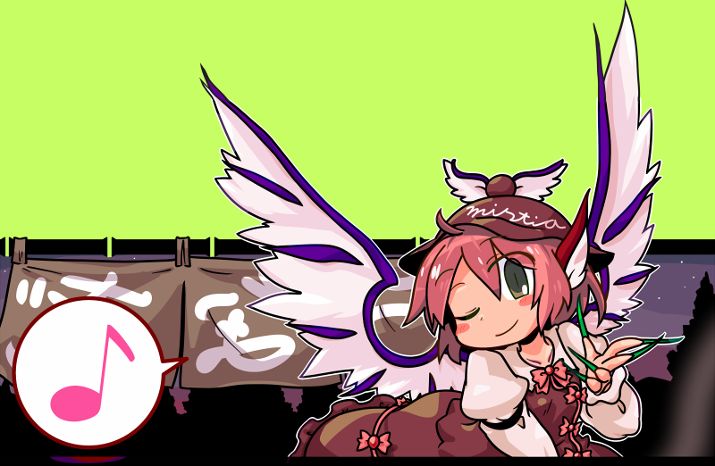 1girl animal_ears bird_ears bird_wings brown_dress brown_hat clothes_writing commentary_request dress fingernails green_nails hat iyau juliet_sleeves long_fingernails long_sleeves musical_note mystia_lorelei pink_hair puffy_sleeves short_hair solo spoken_musical_note touhou white_wings winged_hat wings