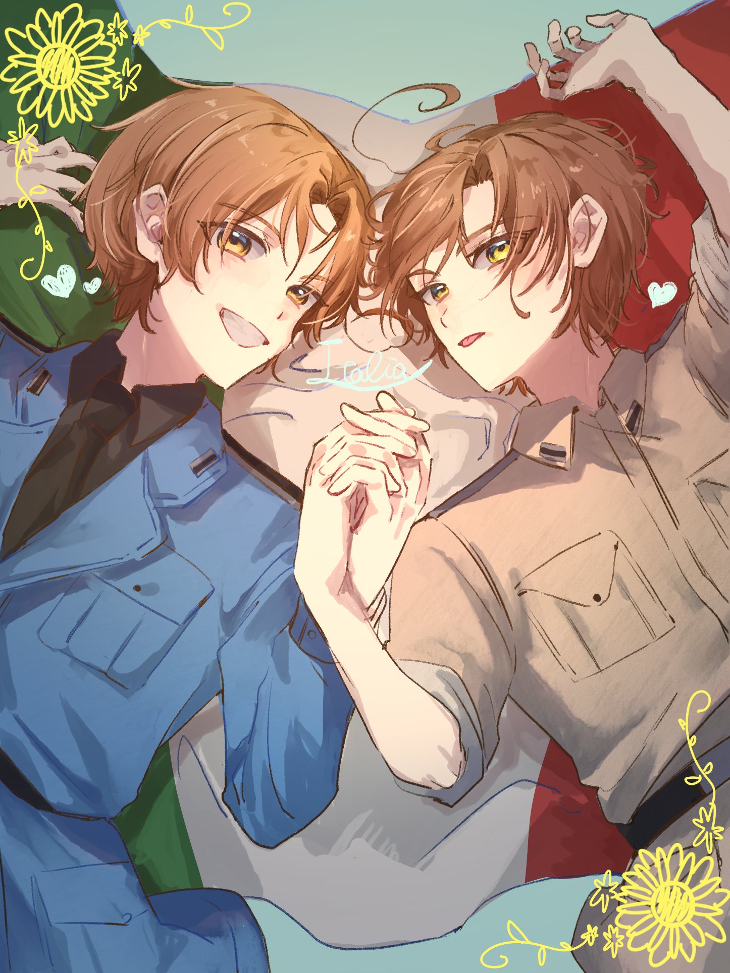 2boys ahoge axis_powers_hetalia belt black_belt black_necktie black_shirt blue_background blue_jacket breast_pocket brothers brown_hair brown_jacket collared_jacket collared_shirt commentary_request fingernails flower hair_between_eyes hand_up highres holding_hands italian_flag jacket lapels long_sleeves looking_at_viewer looking_up lying male_focus meakun military_jacket multiple_boys necktie northern_italy_(hetalia) on_back orange_hair pocket shirt short_hair siblings simple_background sleeves_rolled_up smile southern_italy_(hetalia) teeth tongue tongue_out twins yellow_eyes