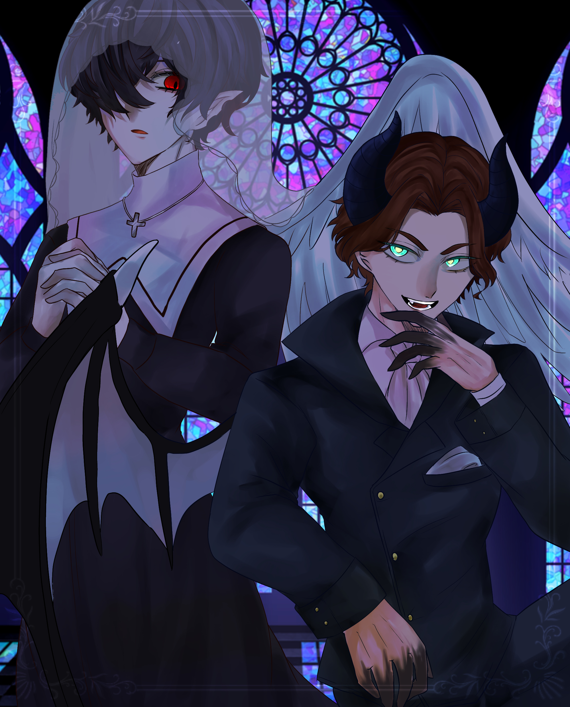 2boys absurdres bags_under_eyes beelzebub_(shuumatsu_no_valkyrie) black_dress black_horns black_jacket black_pants blue_eyes breast_pocket church cloth collared_jacket collared_shirt colored_extremities cowboy_shot cross cross_necklace curly_hair demon demon_boy demon_horns demon_wings dress fang feathered_wings feathers glass hair_between_eyes hand_up high_collar highres horns jacket jewelry long_sleeves looking_at_another male_focus messy_hair multiple_boys neckerchief necklace nikola_tesla_(shuumatsu_no_valkyrie) notched_ear nun open_mouth own_hands_clasped own_hands_together pale_skin pants parted_lips pocket pointy_ears praying red_eyes robe see-through_clothes see-through_veil shirt short_hair shuumatsu_no_valkyrie slit_pupils stained_glass traditional_nun turtleneck turtleneck_dress upper_body veil white_feathers white_neckerchief white_shirt white_veil white_wings wing_collar wings