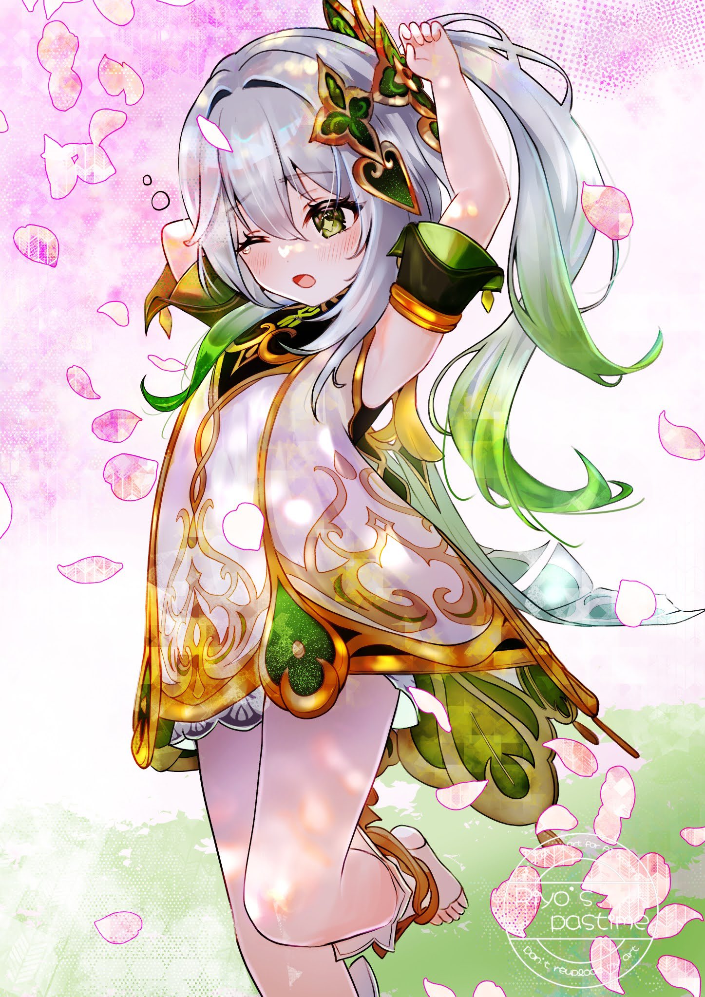 1girl arm_behind_head arm_up bloomers blush commentary_request dappled_sunlight day detached_sleeves dress falling_petals foot_out_of_frame foot_up genshin_impact gold_trim gradient_hair green_eyes green_hair green_sleeves hair_between_eyes han_(riyonosyumi) highres long_hair multicolored_hair nahida_(genshin_impact) one_eye_closed open_mouth petals side_ponytail sleeveless sleeveless_dress solo star-shaped_pupils star_(symbol) stirrup_legwear sunlight symbol-shaped_pupils toeless_legwear toes underwear white_bloomers white_dress white_hair