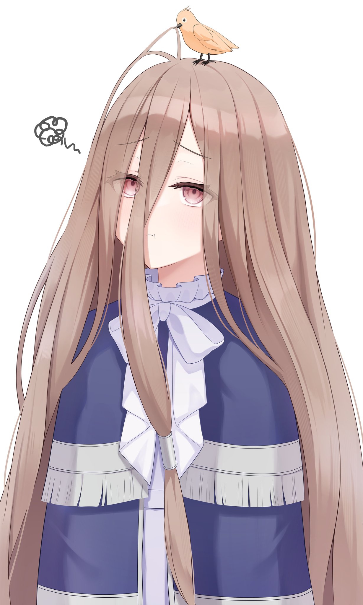 1girl animal animal_on_head bird bird_on_head blue_cloak blush brown_eyes brown_hair cloak dress hair_between_eyes highres honyuuruinomoto long_hair looking_at_animal looking_up on_head ribbon sense_(sousou_no_frieren) sidelocks sousou_no_frieren very_long_hair white_dress white_ribbon
