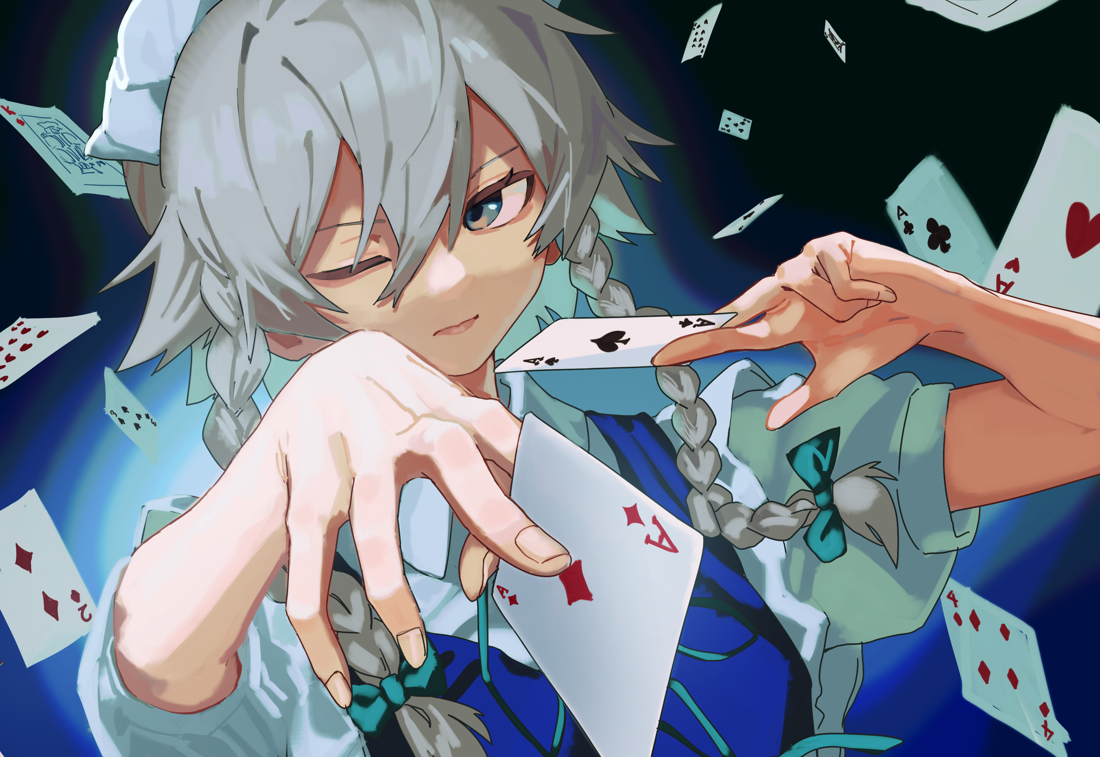 1girl absurdres ace_(playing_card) ace_of_diamonds ace_of_hearts ace_of_spades between_fingers blue_eyes bow braid card card_between_fingers closed_mouth club_(shape) commentary diamond_(shape) green_bow grey_hair hair_bow heart highres holding_card izayoi_sakuya long_hair looking_at_viewer maid maid_headdress one_eye_closed playing_card puffy_short_sleeves puffy_sleeves short_sleeves solo spade_(shape) untranslatable_commentary touhou touhou_lost_branch_of_legend tuck_(tuck23978434) twin_braids