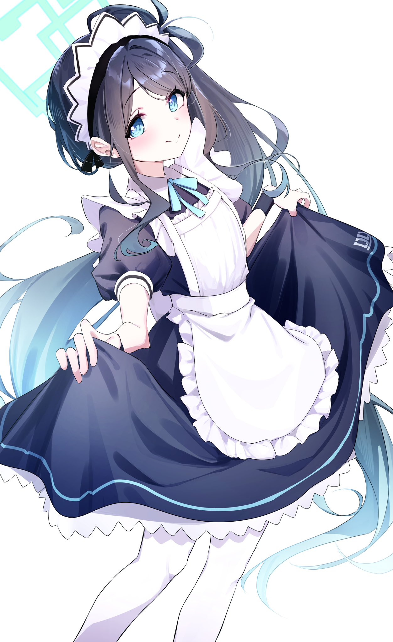 1girl apron aris_(blue_archive) aris_(maid)_(blue_archive) black_hair blue_archive blue_eyes blue_halo halo highres maid maid_apron maid_headdress ponshu_(ponshuislife) side_ponytail sidelocks white_apron white_background